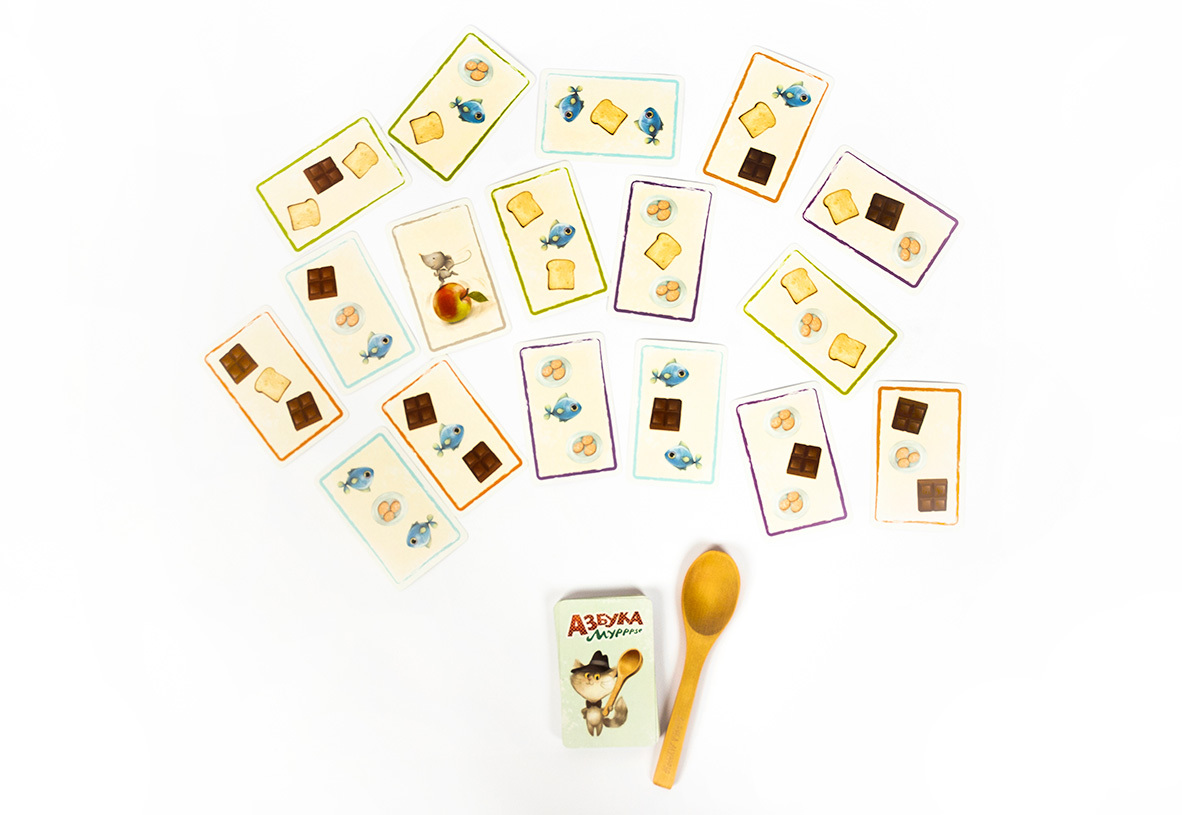 «Азбука Мурррзе» — детская игра на внимательность и слух. В комплект входит деревянная ложка. Игра ориентирована на детей и семьи. В игре 4 различных продукта, каждому из которых соответствует звуковой код. Основная игровая механика – слушать удары ложкой и по их количеству находить и хватать карточки с продуктами.