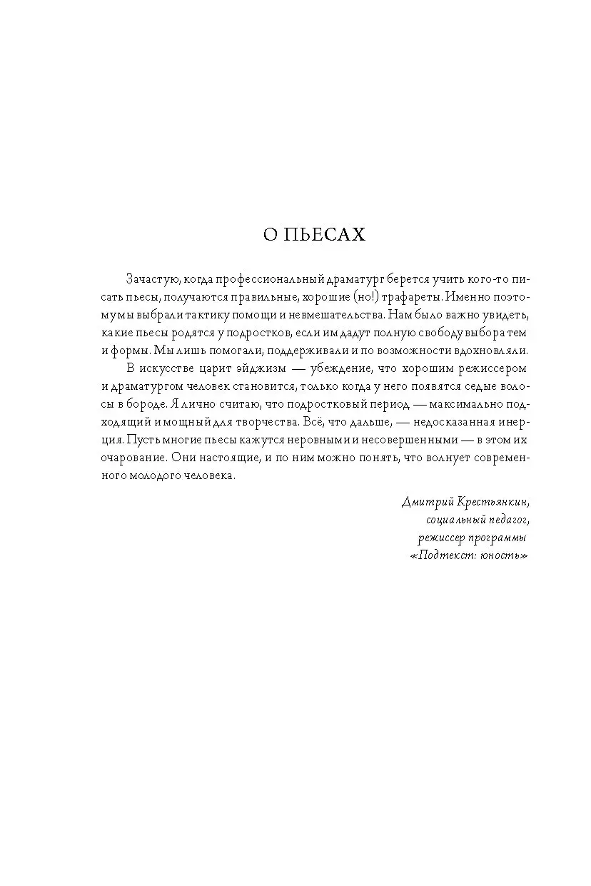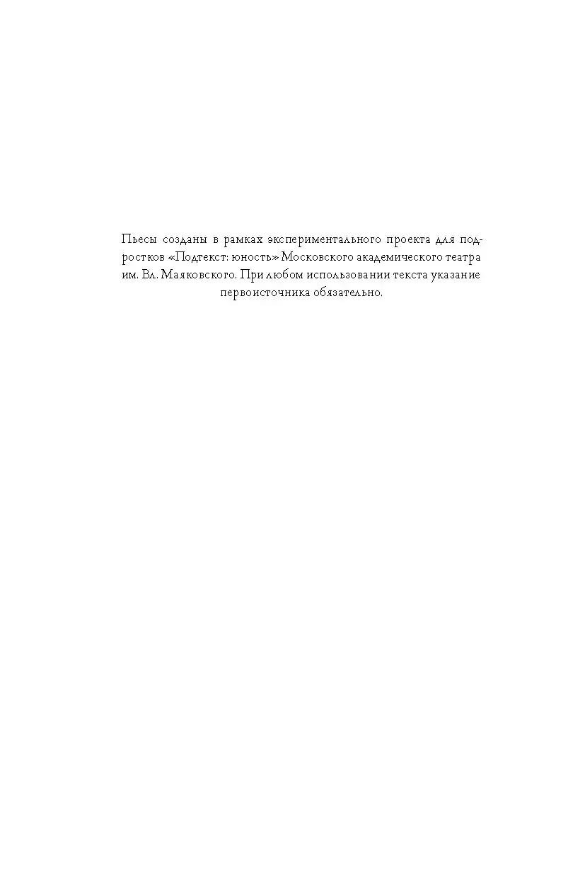 Перед вами сборник пьес молодых драматургов. Десять авторов, одиннадцать произведений. От маленькой внутрисемейной драмы и школьных историй до настоящей антиутопии и современной интерпретации библейских сюжетов, исполненных гуманистических идеалов. Созданы они были в рамках экспериментального проекта «Подтекст:юность» Московского академического театра им. Вл. Маяковского. Драматурги не просто молодые — совсем юные: на момент создания пьес авторам было от неполных 14 до 19 лет.
