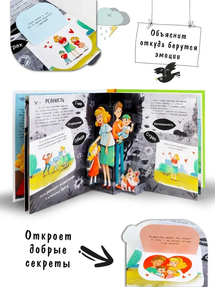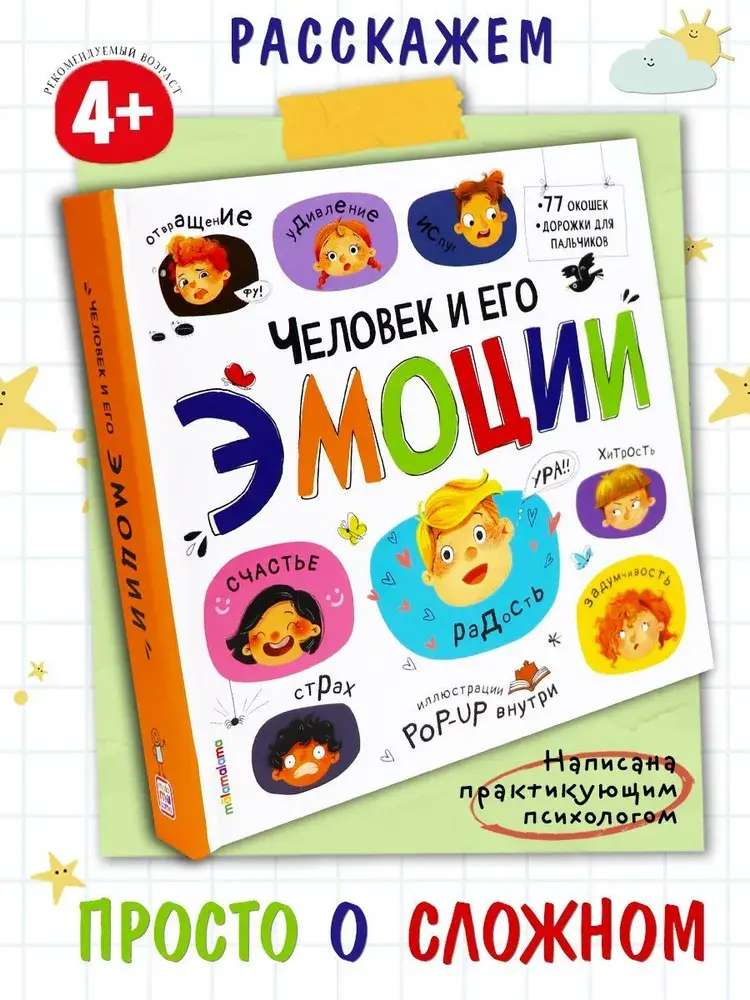 Энциклопедия «Человек и его эмоции» научит ребёнка с лёгкостью ориентироваться во внутреннем мире человека и глубже понимать себя и других. Малыш узнает, какие бывают чувства и эмоции, из-за чего они возникают и о чём сигнализируют, как с ними работать и как их выражать. Внутри книжки 24 страницы c красочными иллюстрациями, целых 77 окошек разной формы, объёмные POP-UP картинки и дорожки для пальчиков. Все интерактивные элементы дополняют процесс изучения и делают его весёлым и увлекательным. Читайте книжку вместе с вашим ребенком - проводите время интересно и с пользой!