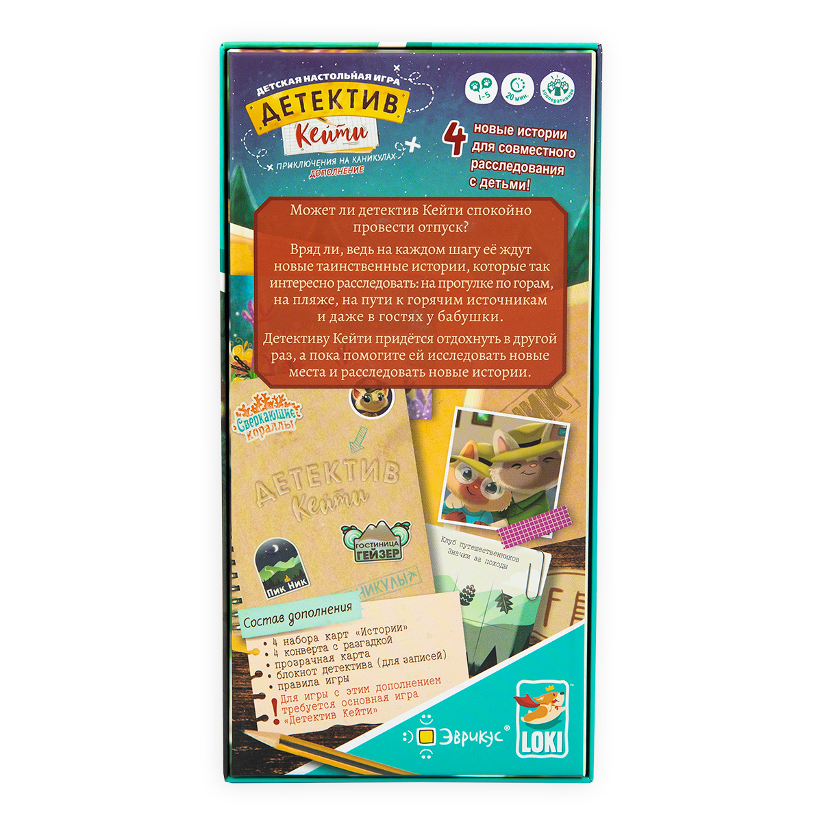 «Детектив Кейти: Приключения на каникулах» — это дополнение к детективной настольной игре «Детектив Кейти» с 4 новыми расследованиями. Новые происшествия в дополнении сложнее, содержат элементы квестов, шифрования и логические загадки.