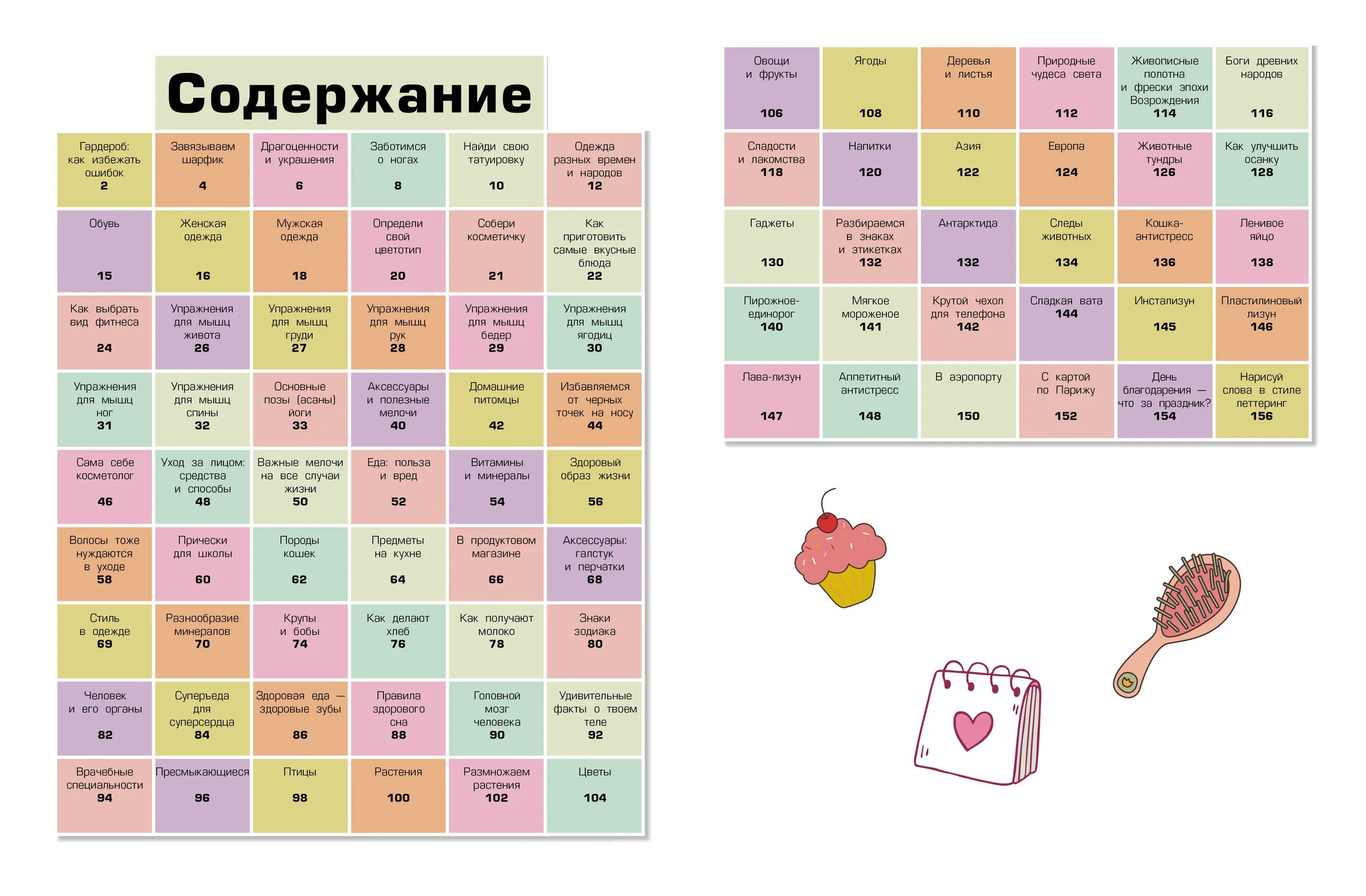 В настоящее время существуют самые разные энциклопедии, и большинство из них содержит огромное количество статей на заданную тему. Мы же предлагаем совсем другую книгу, которая состоит из множества красочных иллюстраций в сопровождении лаконичных подписей, поясняющих суть того или иного явления. Эта энциклопедия предназначена девочкам, ведь на ее страницах представлен визуальный ряд, который заинтересует именно их. Разные виды фитнеса, основные позы йоги, гардероб, аксессуары, прически, татуировки — здесь есть все, что поможет девочке создать собственный образ и сделать свое тело стройным и подтянутым. А умение делать своими руками чехол для телефона, различные поделки-антистрессы, приготовить самые вкусные блюда, научиться ухаживать за лицом и даже нарисовать слова в стиле леттеринг выгодно выделят юную особу среди сверстниц. Есть в книге и иллюстрации, которые помогут девочке сформировать представление об окружающем мире, что, несомненно, повысит ее интеллектуальный уровень. Список тем можно продолжать, ведь в издании содержится более 3000 иллюстрации, которые можно рассматривать целый год.