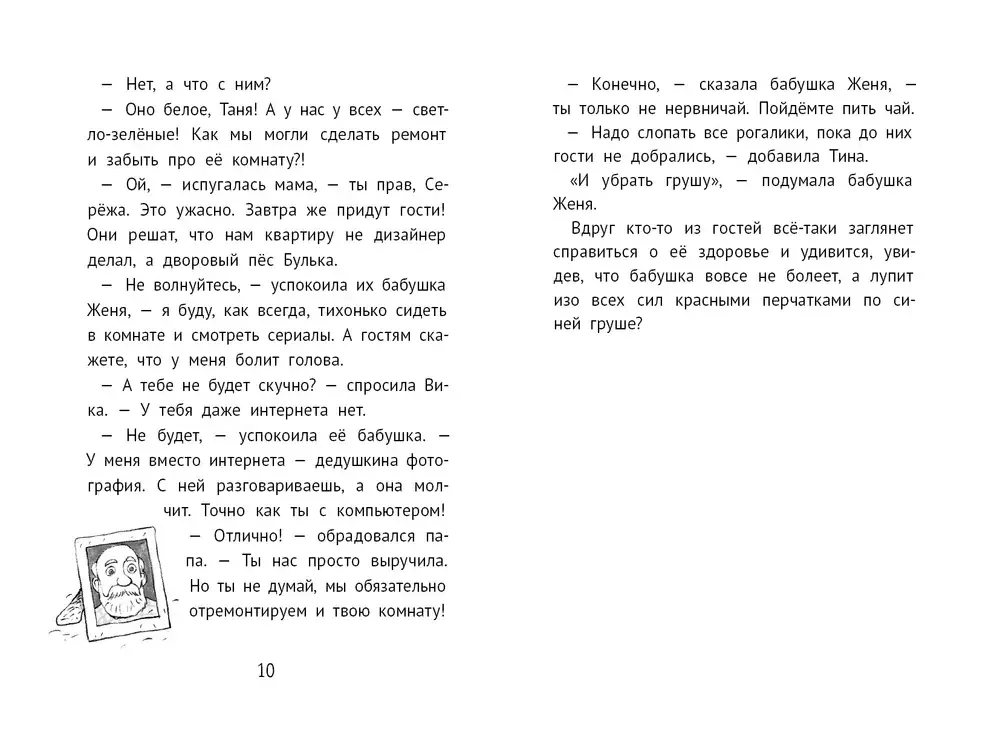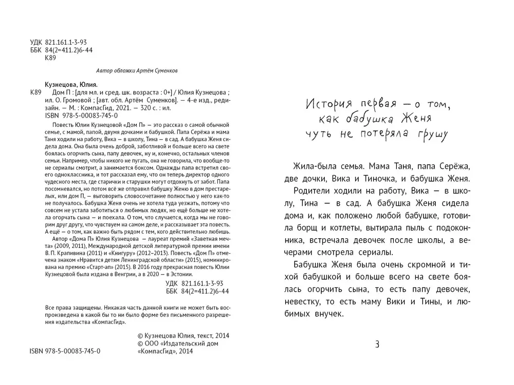 Это рассказ о самой обычной семье, с мамой, папой, двумя дочками и бабушкой. Родители ходили на работу, дети - в школу и в сад. А бабушка Женя сидела дома. Она была очень доброй, заботливой и больше всего на свете боялась огорчить сына. Например, чтобы никого не пугать, она не говорила, что вообще-то не сериалы смотрит, а занимается боксом. Однажды папа встретил своего одноклассника, он теперь директор одного чудесного места, где старички и старушки могут отдохнуть от забот. Папа посомневался, но потом все же отправил бабушку Женю в Дом П. О том, что случается, когда мы не говорим друг другу, что чувствуем на самом деле, рассказывает эта повесть. А еще - о том, как важно быть рядом с тем, кого действительно любишь.