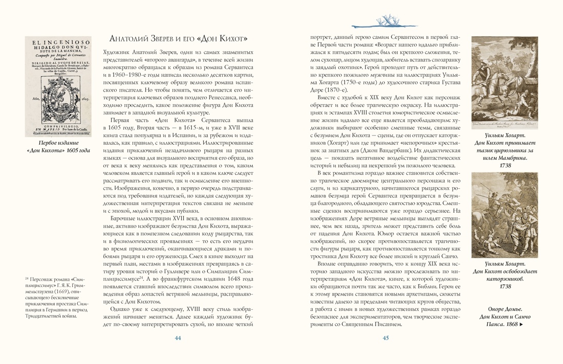 Удивительные картины Анатолия Зверева, вдохновленные Дон Кихотом, сопровождают избранные главы и эпизоды из романа Сервантеса. Прокомментированные крупнейшим испанистом С.И. Пискуновой, они дают представление о развитии основной сюжетной линии романа, и о мировоззрении главного героя. Как многие великие произведения, «Дон Кихот» содержит в себе целый мир – тут и любовные истории, и философские размышления, и приключения. Недаром если триста лет назад «Дон Кихот» воспринимался как пародия на рыцарские романы, то уже в ХХ веке в нем увидели «роман сознания», самое главное в котором - особое восприятие героем окружающего мира.