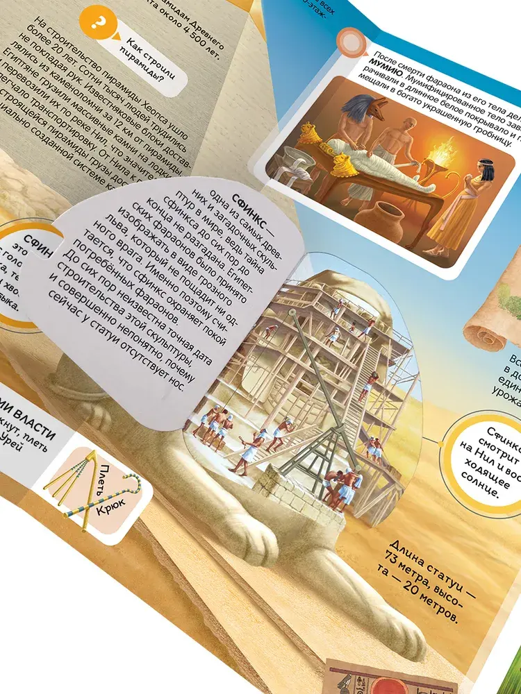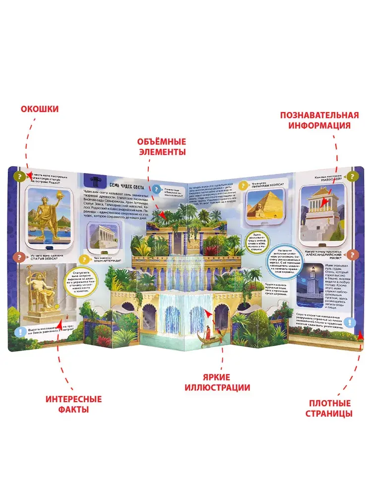 Книги из серии «Энциклопедия открытий» от торговой марки Malamalama — это настоящая сокровищница удивительных фактов и ответов на популярные вопросы маленьких почемучек. Книга «Древний мир» отправляет читателя в путешествие в колыбель цивилизации. На страницах книги появляются древние хижины и египетские пирамиды, улочки греческих полисов, величайшие открытия всех времён и народов, знаменитые чудеса света. Объёмные POP-UP конструкции и красочные иллюстрации сделают изучение запоминающимся и лёгким. Первая энциклопедия для малышей где собраны интересные окошки и объемные картинки! Книгу можно взять в дорогу, чтобы в интерактивной форме развивать интеллект и логику ребенка. книга поможет ребенку развить внимание. Книга отличный подарок для девочек и мальчиков!
