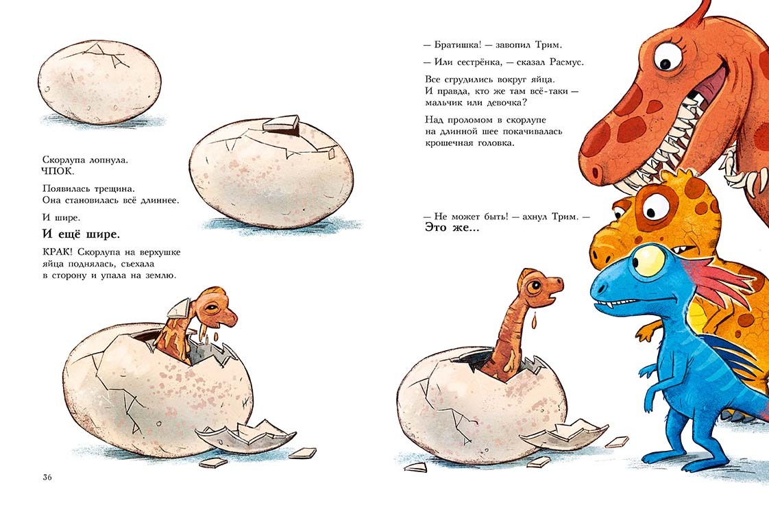 Каждая книга серии «Друзья-динозаврики» рассказывает об одном дне из жизни тираннозаврика Расмуса Рекса и его лучшего друга Трима Троодона. В первой книге друзья идут через густой и опасный болотный лес, чтобы не пропустить радостное событие: у мамы Трима вот-вот проклюнется яйцо. Родители строго-настрого запрещают им ходить через лес, тем более недавно там объявилось какое-то громадное чудовище. Трусоватый и послушный Расмус предлагает идти в обход, но бесстрашный искатель приключений Трим тащит его короткой дорогой через трясину. На каждом шагу друзей подстерегает опасность, и душа у Расмуса поминутно уходит в пятки от страха. Правда, всякий раз тревога оказывается ложной: в лесу они натыкаются на своих друзей, каждый из которых занят каким-то очень важным делом. А потом они встречают строгую маму Расмуса — сейчас им влетит за то, что они нарушили запрет! Однако мама Рекс, узнав, что у Трима должен появиться братишка, смягчается и провожает их до пещеры Трима. А там всех их ждет сюрприз. Из яйца вылупляется не братишка и даже не сестренка Трима, а совсем другой детеныш…