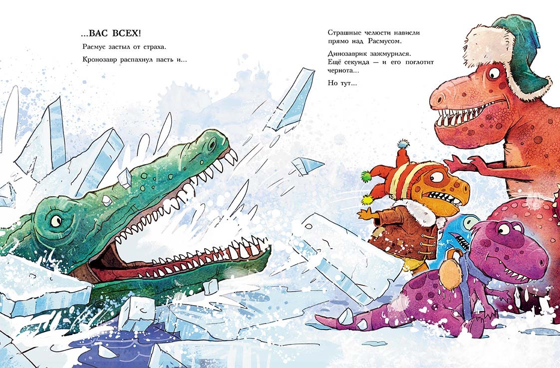 Каждая книга серии «Друзья-динозаврики» рассказывает об одном дне из жизни тираннозаврика Расмуса Рекса и его лучшего друга Трима Троодона. В ту субботу Трим разбудил Расмуса необычайно рано и потащил на улицу. А там впервые за тысячу лет выпал снег! Такого динозаврикам видеть еще не приходилось. Папа Рекс предложил устроить соревнования по зимней рыбалке. Победитель получит приз — целый бочонок скумбрии в томате! Веселая компания отправилась на Большое озеро. Но оказалось, что ловить рыбу подо льдом совсем непросто, и на крючок постоянно попадалось что-то не то. А потом и вовсе попался кронозавр — самое кровожадное подводное чудище на свете! И неизвестно, чем бы все это закончилось, если бы не бабушка Рекс, которая бросилась на защиту любимого внука и обратила в бегство грозного кронозавра.