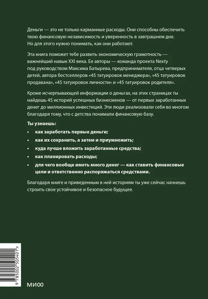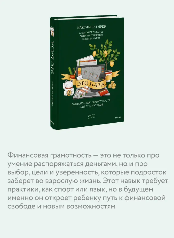 Просто и доступно авторы отвечают на эти и другие вопросы. А еще делятся интересными кейсами и практиками, реальным опытом подростков и взрослых и комментариями экспертов. Все, чтобы помочь ребенку развить экономическую грамотность и полезные финансовые привычки и сделать первый шаг к финансовой независимости.