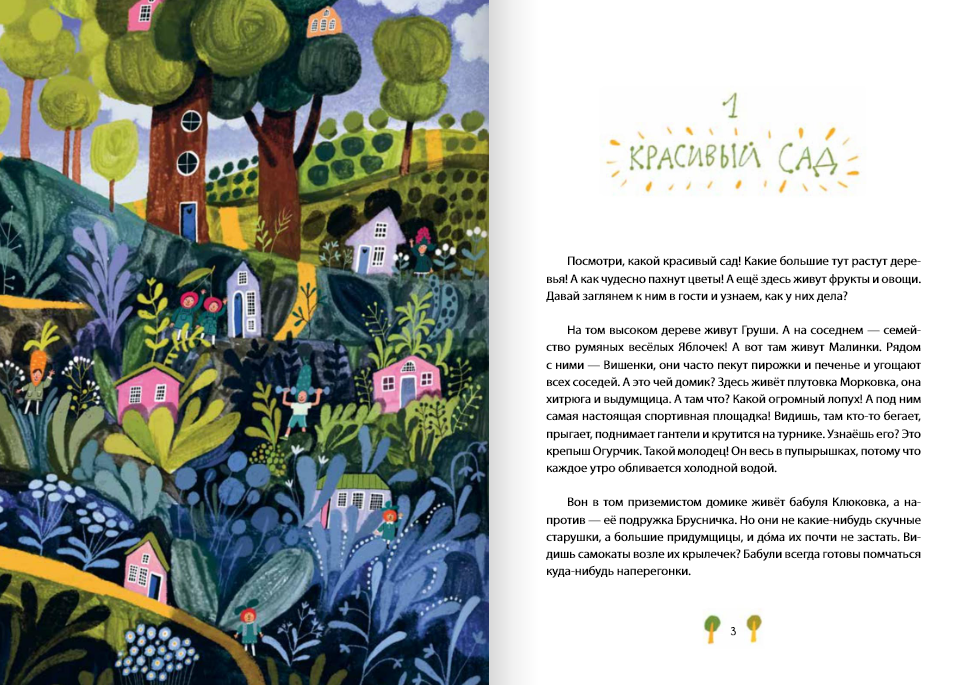 Здесь в маленьких домиках живут хитрюга Морковка и лежебока Кабачок, тётушка Груша, весёлые Вишенки и многие другие. Они, как настоящие соседи, делятся новостями, дружат, спорят, обижаются, мирятся и всегда приходят друг другу на помощь!
