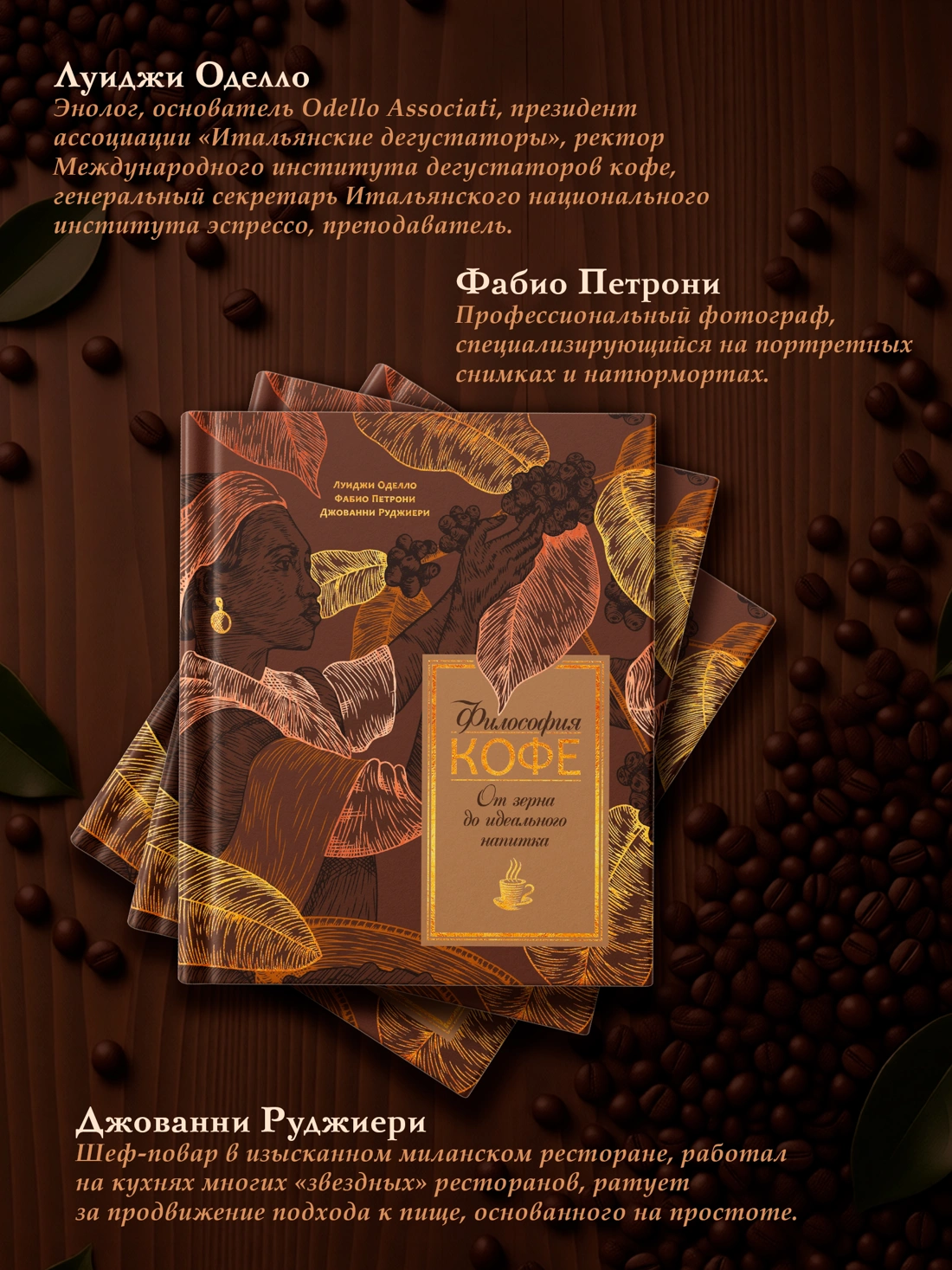 Освойте техники приготовления лучших мировых рецептов, откройте секреты идеальной дегустации и вдохновитесь историей напитка, покорившего сердца людей по всему миру. Знаменитый энолог и мировой эксперт Луиджи Оделло приглашает Вас пройти полный путь кофе — от лучших сортов робусты и арабики до современных способов обработки и обжаривания зерен. Исследуйте новые грани классического эспрессо, нежнейшего капучино и утонченного макиато в сопровождении эстетичных фотографий Фабио Петрони. Бонусом станут эксклюзивные рецепты известного шеф-повара Джованни Руджери, в которых кофе выступает неотъемлемой частью утонченных блюд и изысканных кондитерских изделий. Пусть эта книга станет вашим ключом к тонкой философии культового напитка!