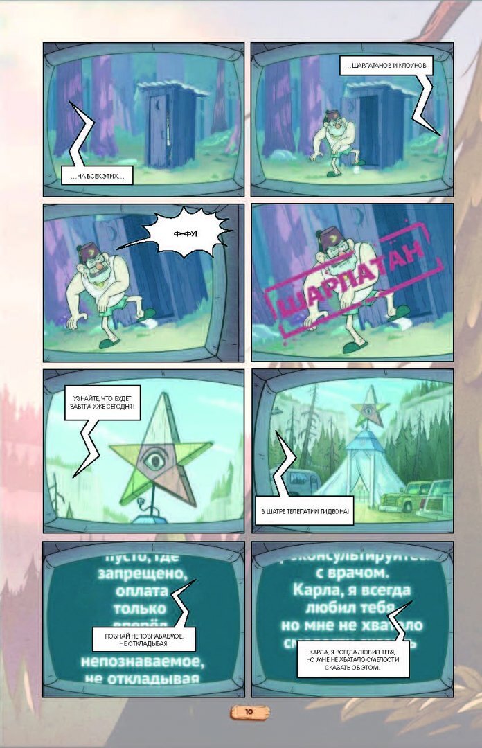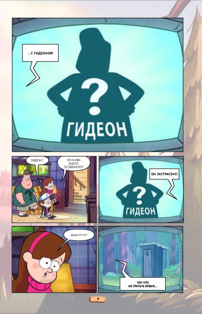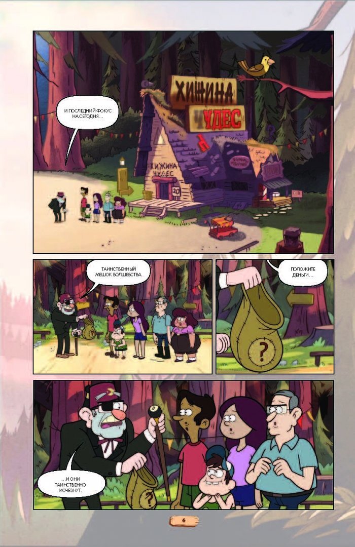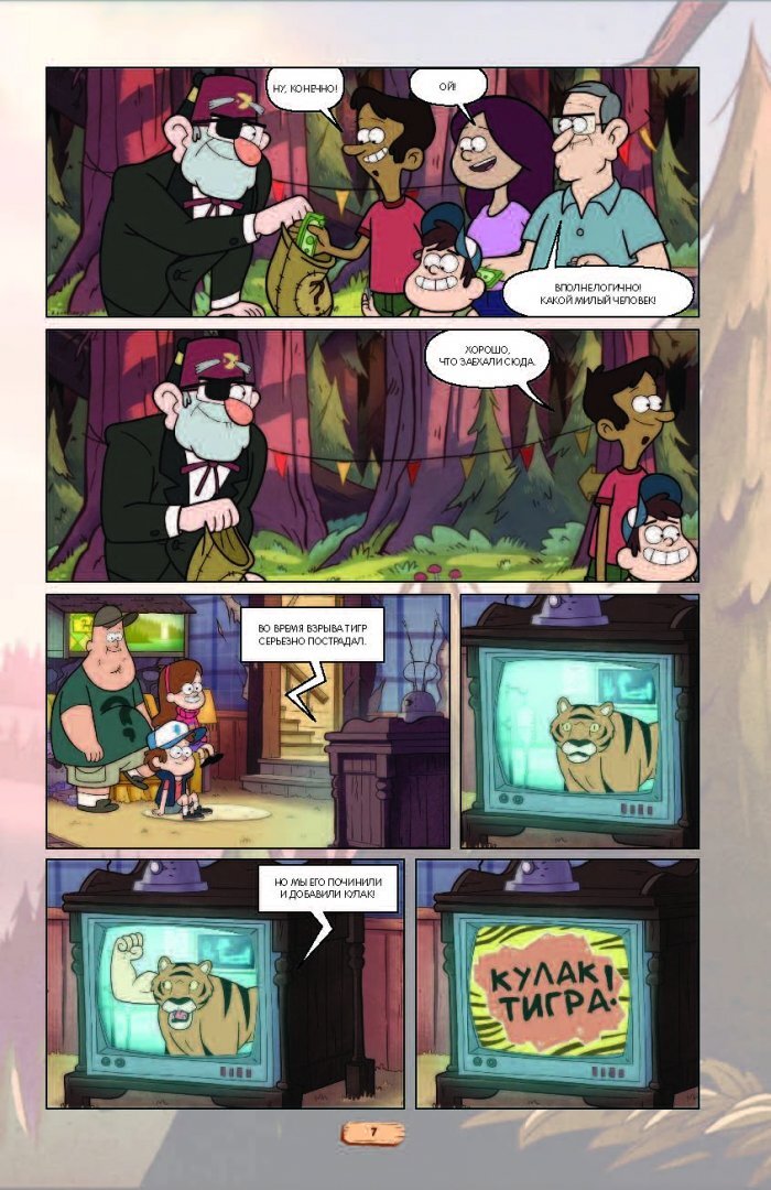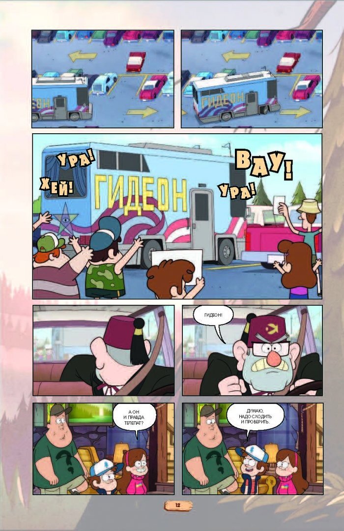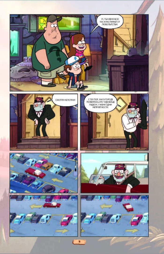 Отличный сборник комиксов по 4, 5, и 6-й сериям первого сезона «Гравити Фолз» отпечатан на мелованной бумаге, так что можно с удовольствием рассматривать картинки (и, кстати, заметить то, чего совершенно нельзя увидеть, когда смотришь сериал) и наслаждаться остроумными репликами двойняшек Пайнс, их дяди Стэна и других обитателей Гравити Фолз — городка, который только кажется сонным, а на самом деле…