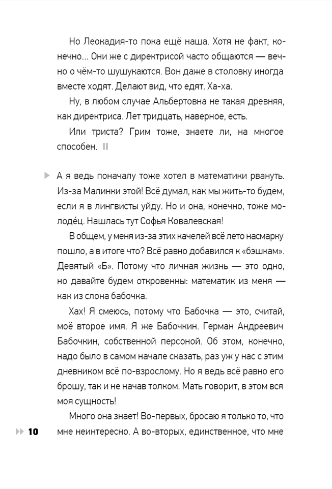 Григорий Бабочкин и Герман Сто… нет, Герман Бабочкин и Григорий Столяров. Два совершенно непохожих подростка. Один мечтает стать хоккеистом, идёт к этому семимильными шагами, попутно становясь любимцем всех вокруг. Другой - объект всеобщих насмешек, но при этом как будто… бесстрашный? безрассудный? Новый роман Анны Зеньковой - удивительной силы текст, раскрывающий личности 14-летних героев во всём противоречии и во всём том общем, что есть у подростков. Построенная в форме двух аудиодневников, которые Григорий и Герман ведут в течение учебного года, книга отзовётся в душе у каждого - подростка или взрослого.