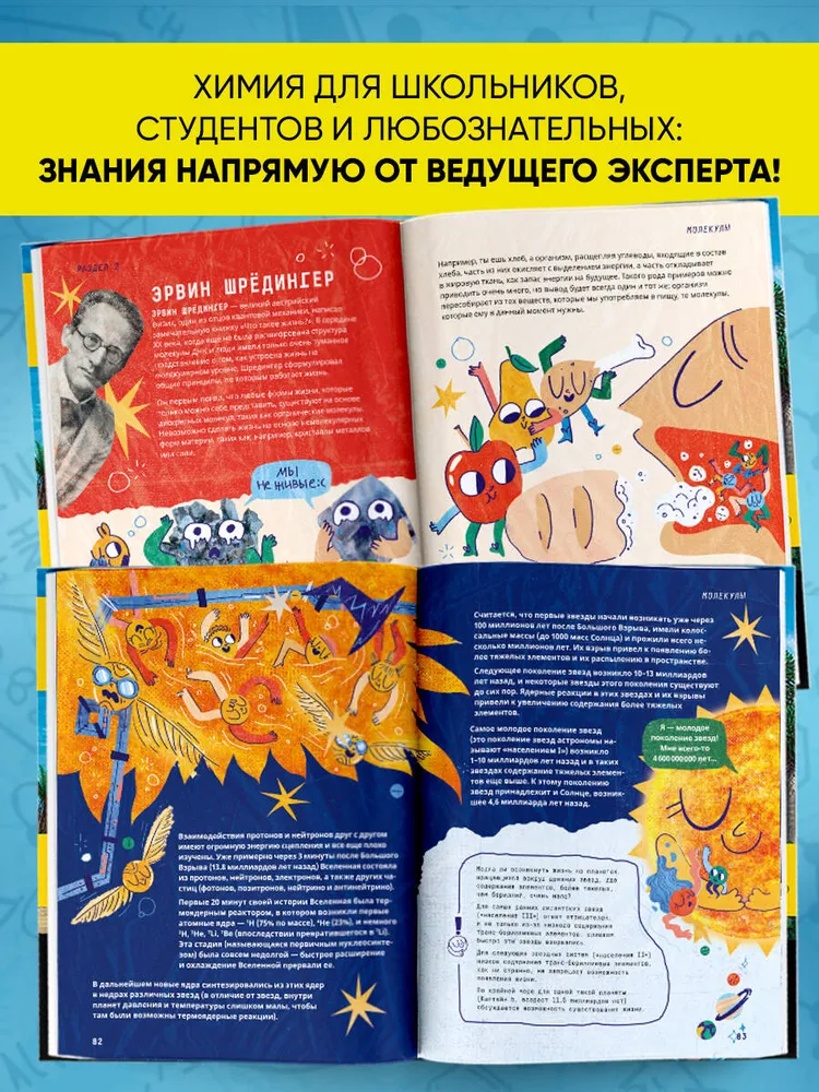 Книга известного учёного Артёма Оганова расскажет школьникам о химических элементах, атомах и молекулах, кристаллах, а яркие запоминающиеся иллюстрации художника Василисы Зинковой дополнят интересный рассказ, заставив подростков улыбнуться. В книгу добавлены QR-коды, с помощью которых можно посмотреть видео химических опытов, поставленных в лаборатории автором.