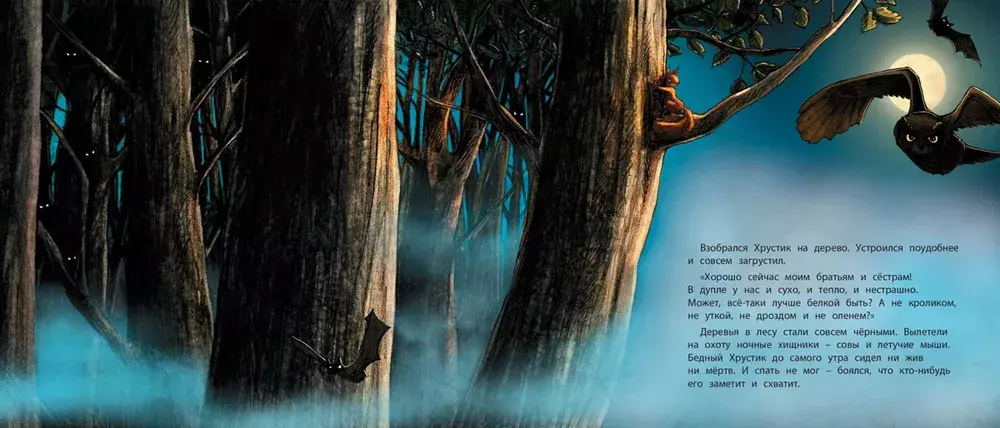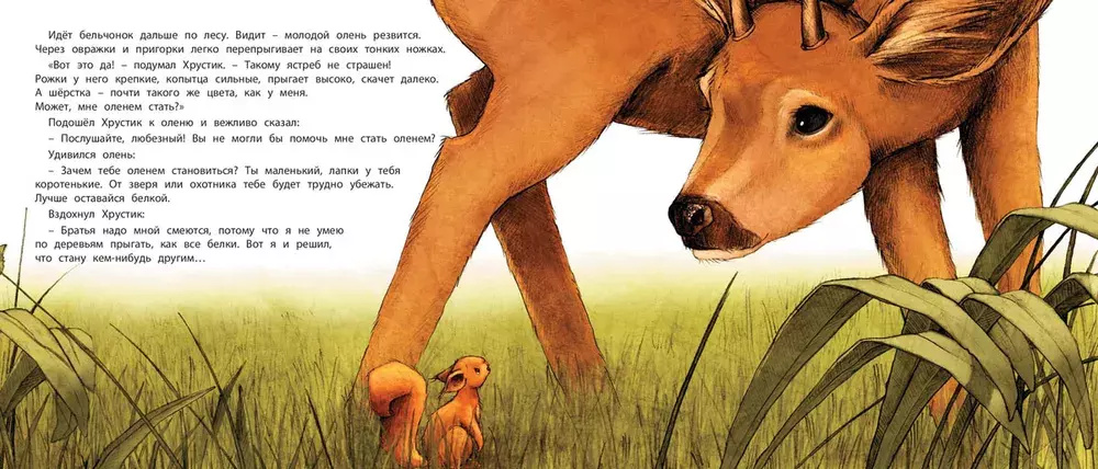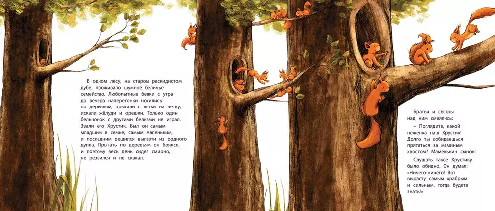 Маленький бельчонок Хрустик был таким робким, что братья и сёстры смеялись над ним и дразнили "маменькиным сынком". И вот однажды он собрался с духом и выбрался из гнезда. Он попробовал побыть кроликом, уткой, дроздом и даже оленем. Но, конечно, в конце концов бельчонок понял, что лучше всего быть самим собой. К тому же он сумел преодолеть свою робость и стал самым храбрым бельчонком на свете!