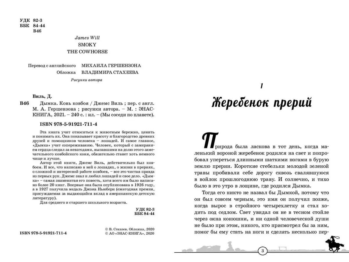 Автор этой книги, Джемс Виль, действительно был ковбоем. И все, что написано в ней о лошадях, о жизни в прериях, о сложной и интересной работе ковбоев, – все это чистая правда из первых рук. Джемс знал и любил лошадей и свое дело. "Дымка" – самая знаменитая его повесть, хотя всего им было написано более 20 книг. Впервые она была опубликована в 1926 году, а в 1927 получила медаль Джона Ньюбери (ежегодная премия, присуждаемая за выдающийся вклад в американскую детскую литературу).