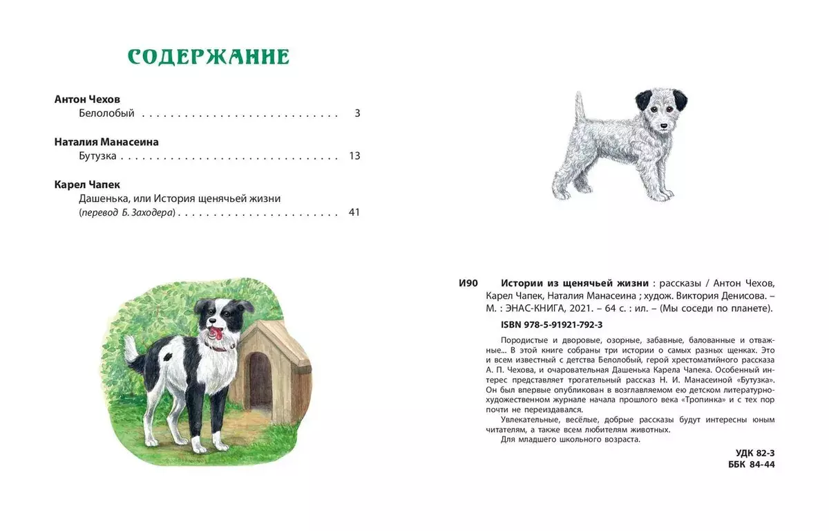 Породистые и дворовые, озорные, балованные и отважные... В этой книге собраны три истории об очень разных щенках. Юному читателю наверняка понравятся и отважный Белолобый, герой хрестоматийного рассказа А. П. Чехова, и непослушная Бутузка из одноименного рассказа Н. И. Манасеиной и очаровательная Дашенька известного чешского писателя Карела Чапека. Все щенки в этой книге – как живые благодаря чудесным иллюстрациям Виктории Денисовой