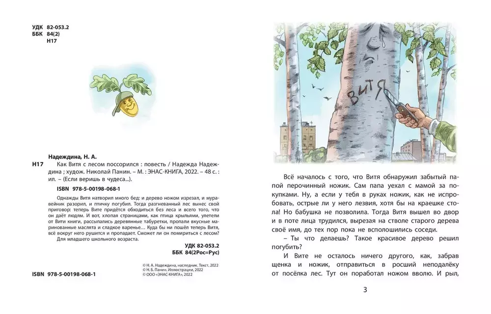 Однажды Витя натворил много бед: и дерево ножом изрезал, и муравейник разорил, и птичку погубил. Тогда разгневанный лес вынес свой приговор: теперь Вите придётся обходиться без леса и всего того, что он даёт людям. И вот, хлопая страницами, как птицы крыльями, улетели от Вити книги, рассыпались деревянные табуретки, пропали вкусные маринованные маслята и сладкое варенье… Куда бы ни пошёл теперь Витя, всё вокруг него рушится и пропадает. Сможет ли он помириться с лесом?