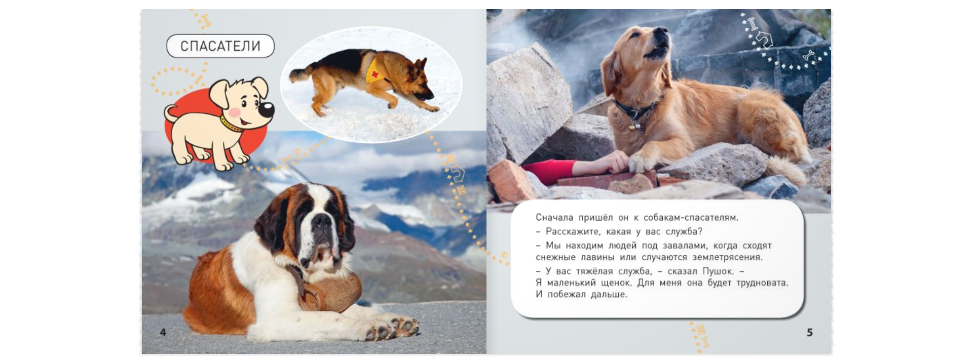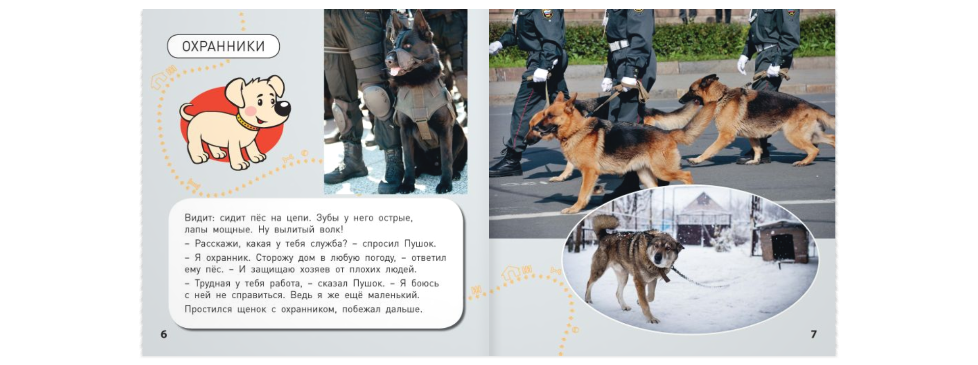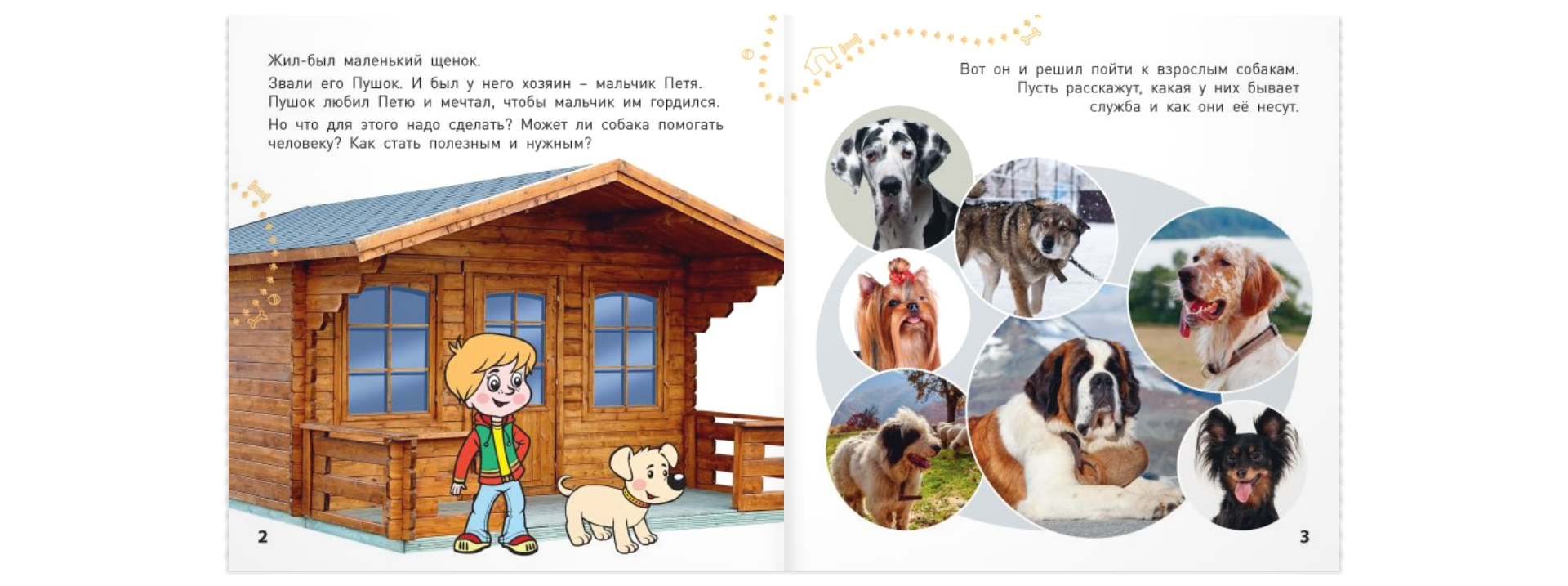 Был у мальчика Пети забавный щенок по кличке Пушок. Однажды щенок задумался: а как он может лучше всего послужить своему хозяину? И решил Пушок пойти к взрослым собакам – пусть расскажут, какая у них бывает служба и как они её несут.