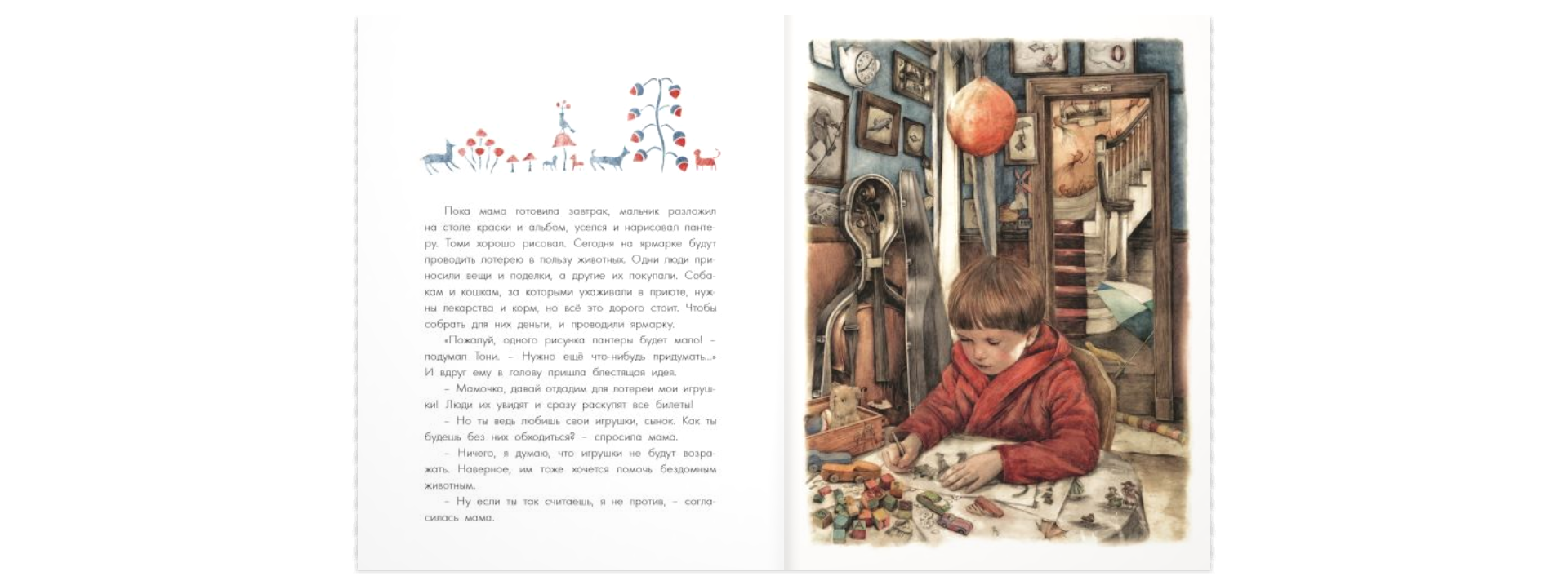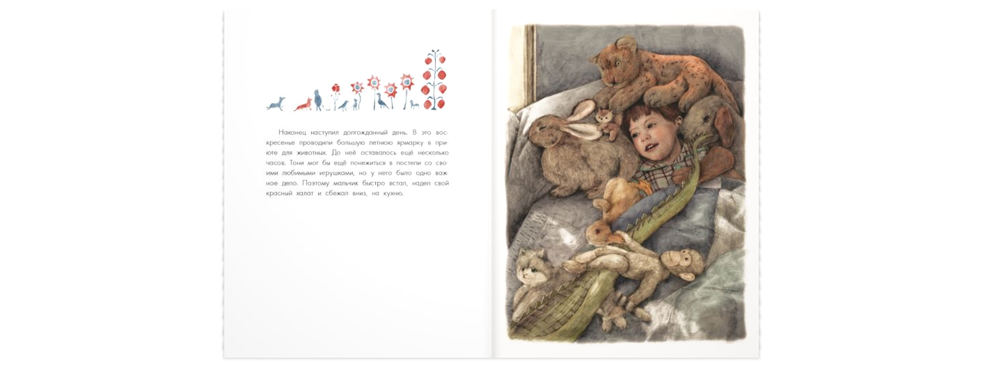 У Тони много плюшевых игрушек. Он их так любит, что не может без них уснуть. Но еще больше Тони любит животных.  Чтобы помочь приюту для бродячих кошек и собак, он отдает все свои игрушки для благотворительной ярмарки. Лишившись своих драгоценных друзей, Тони обретает новых, очень необычных. Книга учит милосердию и состраданию к слабым существам, которые так нуждаются в человеческой защите. Эта трогательная история с волшебными иллюстрациями порадует любителей животных всех возрастов.