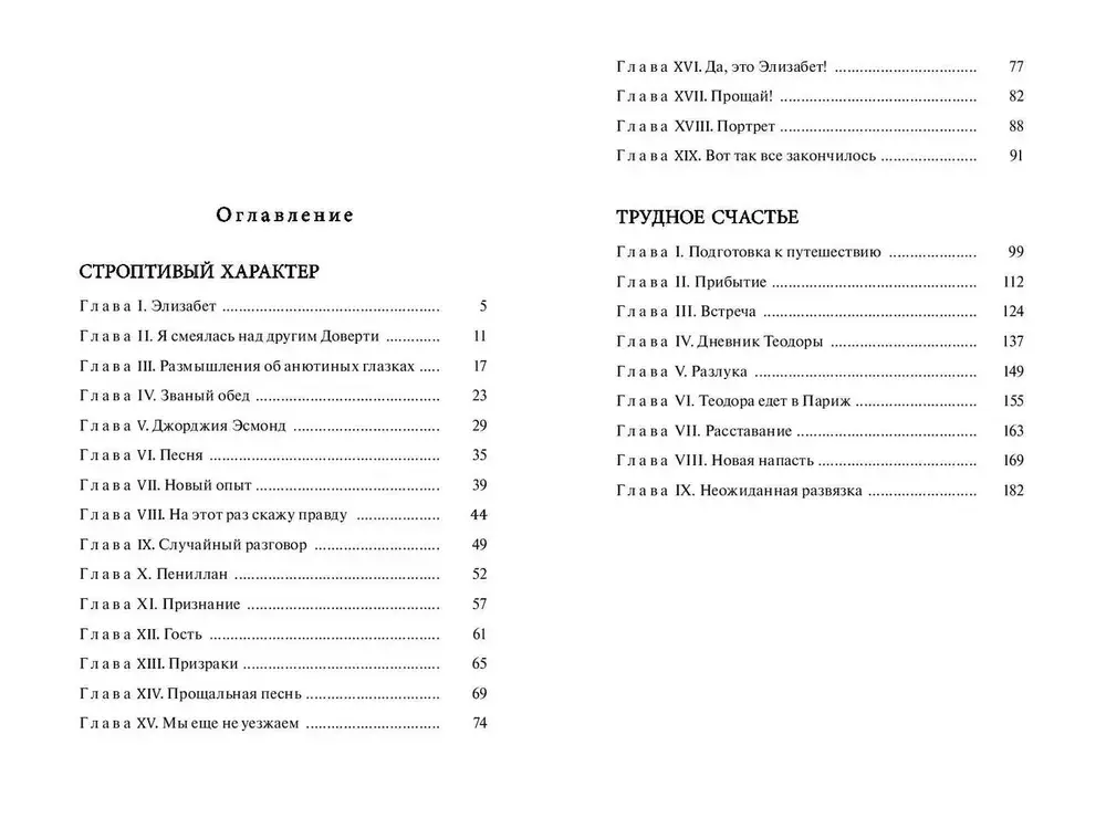 В России Фрэнсис Бернетт знают и любят как автора трогательных детских повестей «Таинственный сад», «Маленькая принцесса» и «Маленький лорд Фаунтлерой». Между тем ее перу принадлежит немало романтических историй для более взрослой аудитории. В своих ранних произведениях Бернетт говорит с читателем о любви с тактом и мудростью, будит лучшие чувства, учит бережному отношению к ближним. Женские образы писательницы всегда полны достоинства и очарования. У героини повести «Строптивый характер», красавицы Элизабет, действительно скверный нрав, и она это прекрасно осознает. Гордая и неприступная девушка не щадит чувств своих многочисленных поклонников. В ранней юности она жестоко обидела влюбленного в нее молодого человека, на многие годы испортив ему жизнь. Но и самые неприступные крепости порой сдаются… Теодора, героиня повести «Трудное счастье», напротив, скромная и робкая девушка. Она никак не может поверить, что достойна своего прекрасного возлюбленного. И заслуженное счастье дается ей очень непросто…