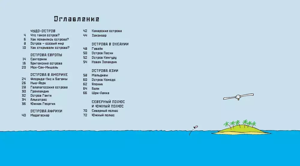 Участок суши посреди реки, моря или океана называется островом. Как возникают острова? Почему на них складываются особые природные условия? Какие самые известные острова расположены в разных частях света? Простым, понятным языком автор расскажет маленьким читателям о Японии, Исландии, Бали, Мадагаскаре и многих других удивительных островах. Книга иллюстрирована высококачественными художественными фотографиями и забавными авторскими рисунками. А чтобы чтение было еще интереснее, на каждом развороте предлагается выполнить несложное задание.