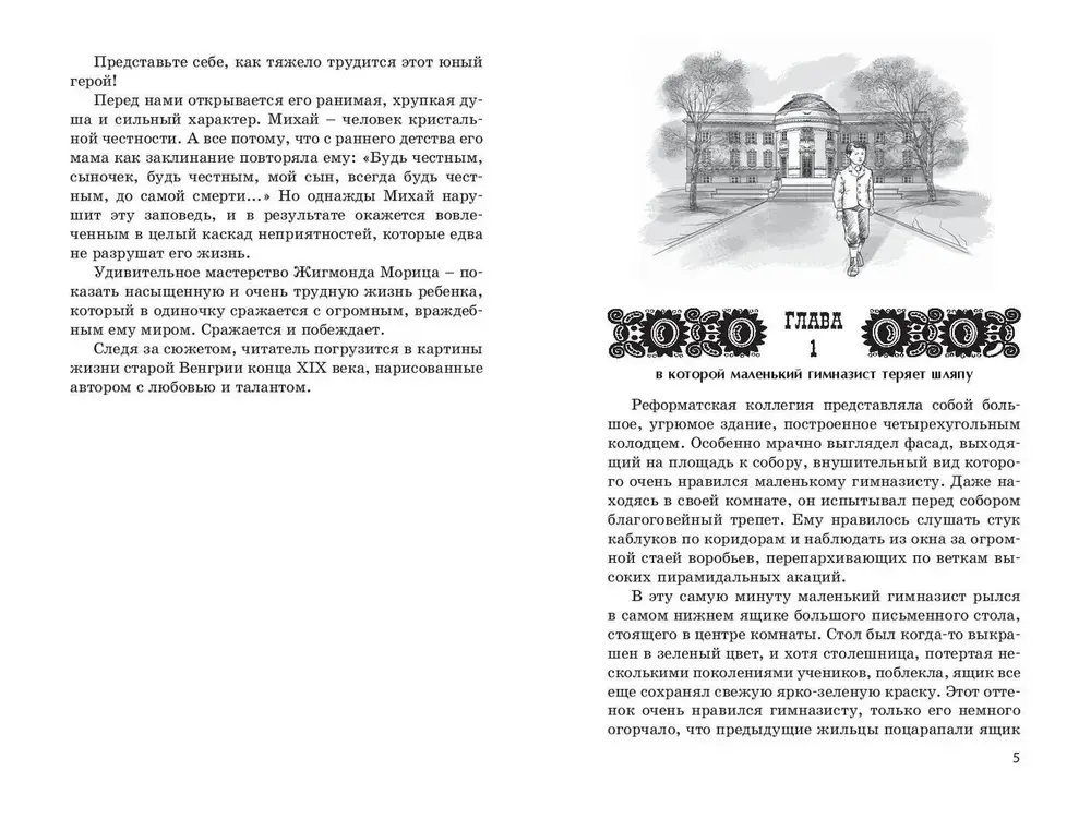 Юный Михай Нилаш живет вдали от семьи и учится в знаменитой венгерской Дебреценской гимназии. Болезненно щепетильный, хрупкий мальчик очень страдает от одиночества и отчаянно скучает по отцу и матери. Рядом с ним нет ни одного близкого человека, который мог бы дать добрый совет, утешить и обнять. Из-за чужой подлости и неудачного стечения обстоятельств Михай попадает в неприятное, двусмысленное положение. Ему придется отстаивать свою честь и нести на плечах ношу, непосильную для ребенка. Эта проникновенная повесть принадлежит перу Жигмонда Морица (1879–1942) – одного из самых популярных в Венгрии писателей.