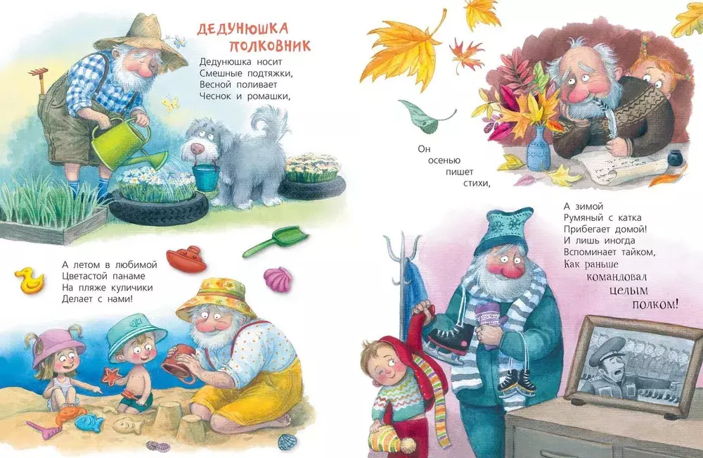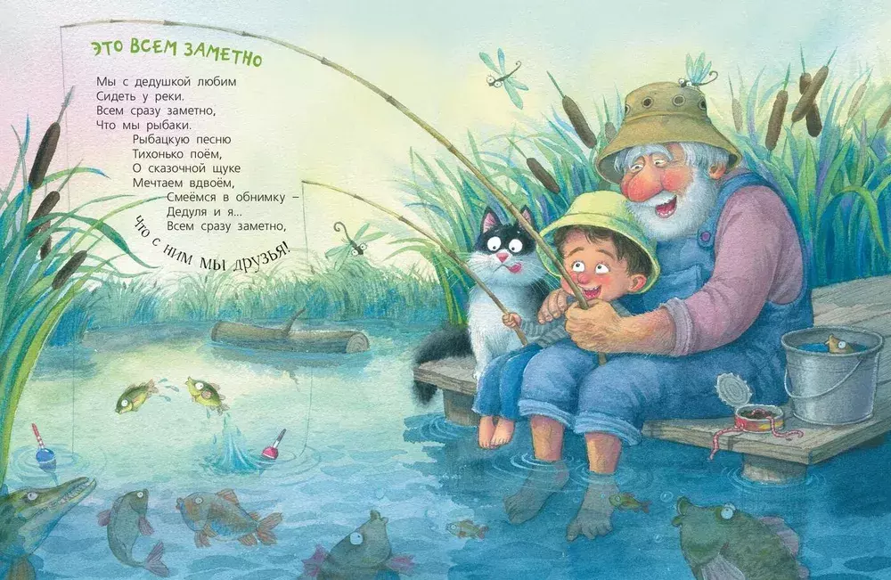 Когда речь заходит о дедушках, внуков не удержать – они весело тянут руки, нетерпеливо подпрыгивают, перебивают друг друга: «Я расскажу про дедушку!», «И я расскажу!», «А можно я тоже!» Какие весёлые, трогательные, по-детски радостные, а иногда даже сказочные получаются истории! Наталья Карпова превратила эти истории в стихи, и получилась целая книжка про самых лучших на свете дедушек. А веселые и красочные иллюстрации к ней создала Любовь-Ерёмина Ношин.