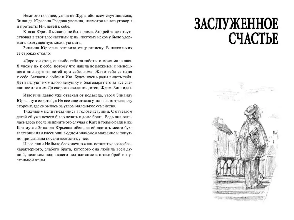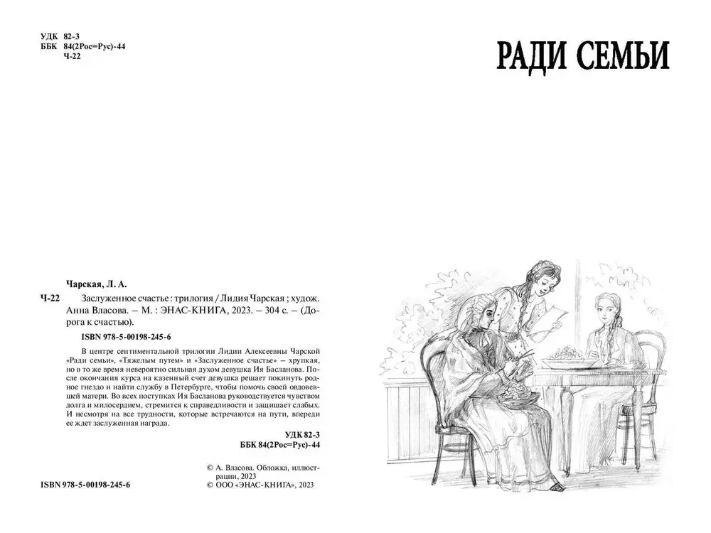 В трилогию вошли три повести Лидии Чарской – «Ради семьи», «Тяжелым путем» и «Заслуженное счастье», – объединенные общей героиней. Ия Басланова – хрупкая, но в то же время невероятно сильная духом девушка. После окончания института она решает покинуть родное гнездо и найти службу в Петербурге, чтобы помогать овдовевшей матери и младшей сестре. Во всех своих поступках Ия руководствуется чувством долга, стремится к справедливости и защищает слабых. И, несмотря на все трудности, которые встречаются на пути, впереди ее ждет заслуженная награда.