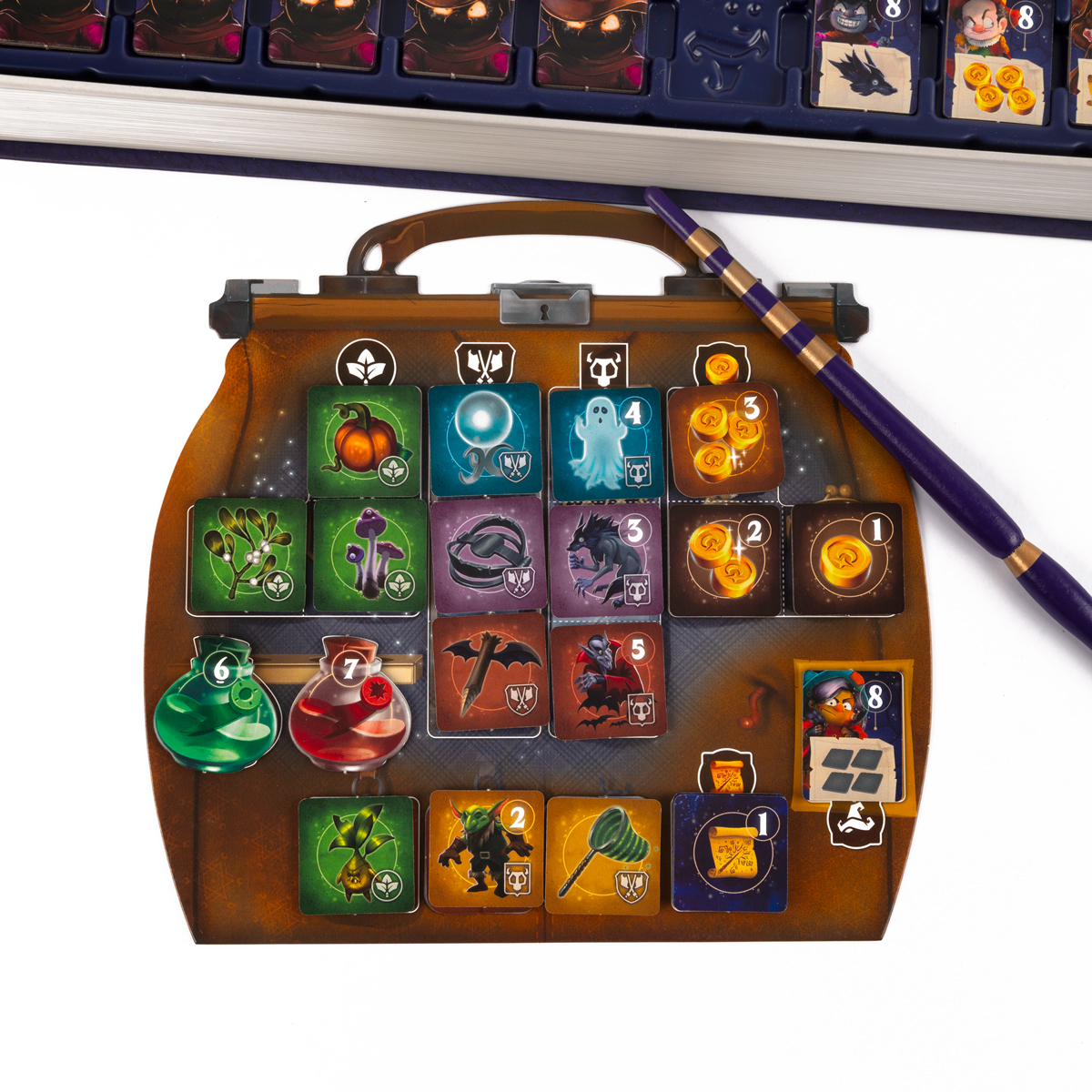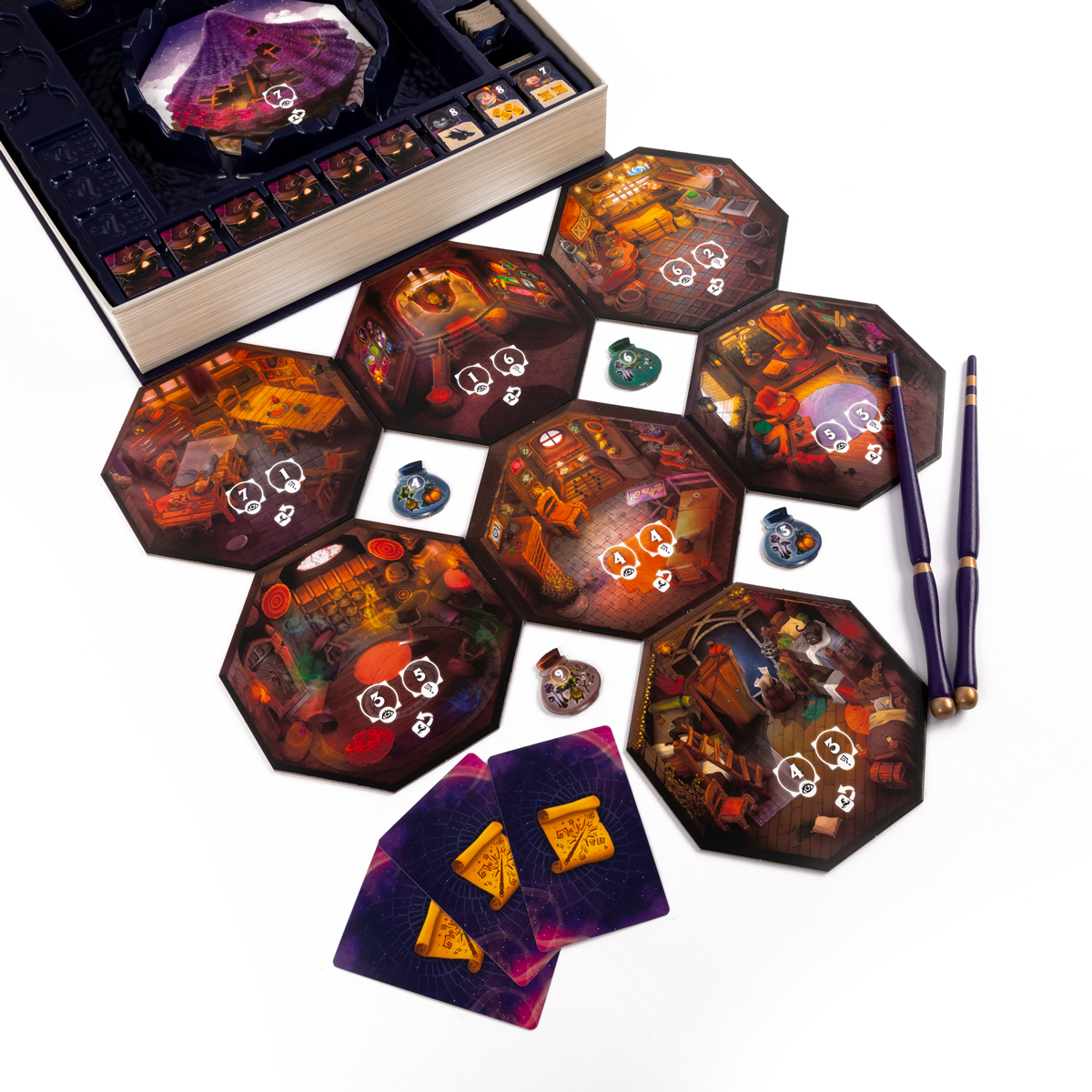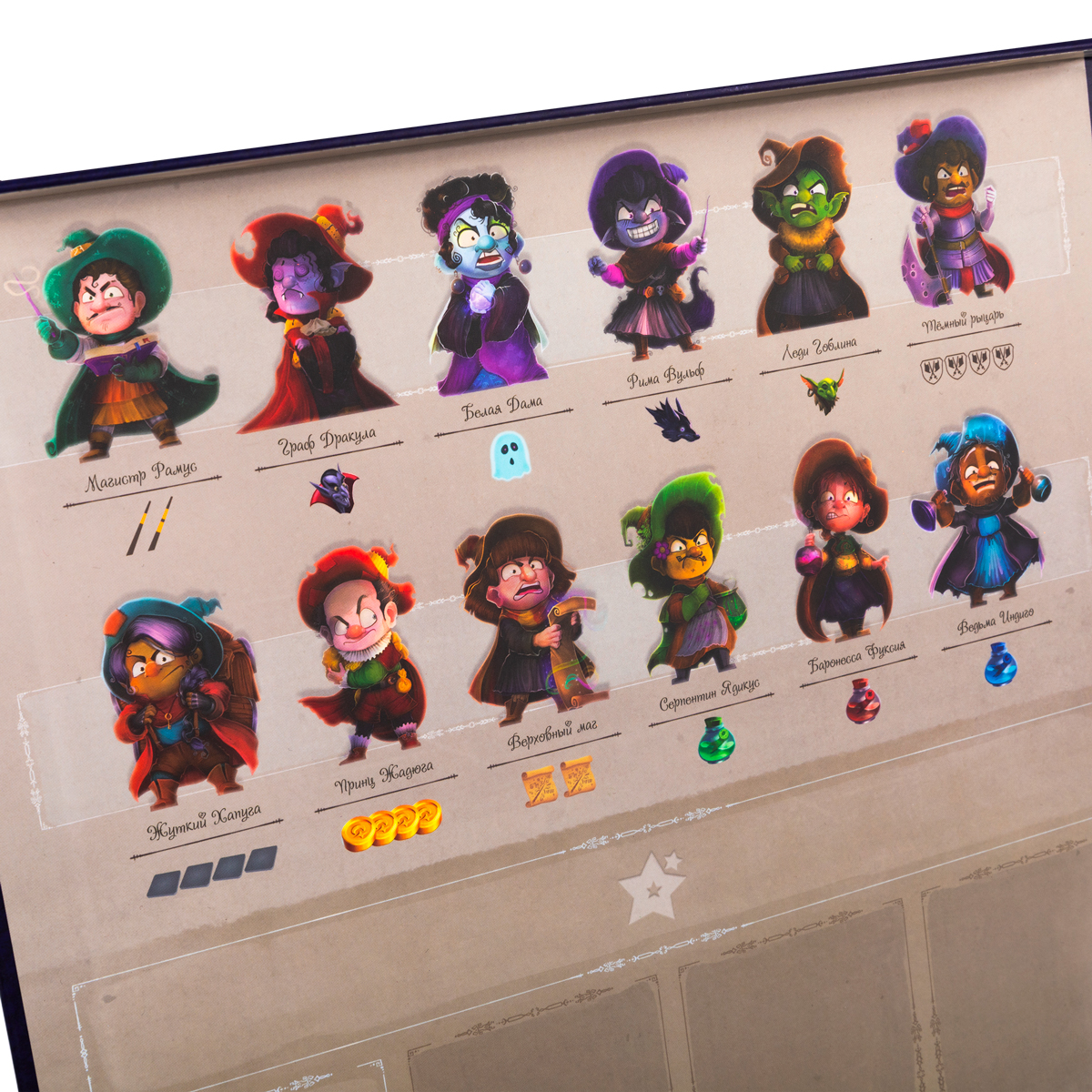 В тёмную и ветреную ночь вы, отважные волшебники, отправляетесь в жуткое и опасное место с важной миссией. Ваша цель - исследовать зловещую башню, полную тайн и загадок. В глубинах подземелья скрываются могущественные силы зла, с которыми вам предстоит сразиться в финале вашего приключение. Только самые умелые и находчивые смогут добыть ценные артефакты, оружие и зелья, чтобы и одержать победу над злыми колдунами, заслужив почётный титул «Великий волшебник» или «Великая волшебница».«Инкантибус» — это захватывающая семейная игра, в которой игроки выступают в роли волшебников, исследующих таинственную башню. Цель игры - получить как можно больше очков волшебства, находя ценные артефакты, готовя зелья, ловя монстров и побеждая врагов. Выбирайте уровень сложности, откройте коробку, выполненную в виде магического фолианта, возьмите в руки почти настоящие деревянные волшебные палочки, и вы уже почти готовы к игре.«Инкантибус» — интересная игра с не совсем обычными механиками аукциона и сбора сетов, в которой ваши жадность и удача сыграют немаловажную роль. Игроки одновременно указывают своими волшебными палочками на жетоны, которые хотят получить, а вот результаты зависят от количества игроков, претендующих на один и тот же жетон, а также от типа жетона.Особенности игры- атмосфера волшебства- великолепное оформление- коробка - часть игры- 2 уровня сложности игры- динамичный геймплейКому подойдёт эта игра?- Любителям магии и фэнтези- Для игры в кругу семьи- Детям для игры со сверстниками- В качестве подарка для тех, кто мечтает стать волшебникомКак играть?Игра начинается с подготовки волшебного фолианта и всех компонентов. После этого вы отправляетесь в захватывающее приключение по зловещей башне. В игре будет столько раундов, сколько комнат башни вам предстоит исследовать в зависимости от количества игроков.Каждый раунд вы осматриваете одну из комнат, пока не дойдёте до подземелья в самом низу башни.Осматривая комнату, вы получаете разные жетоны, чтобы вооружиться для финального сражения и получить очки волшебства, которые помогут вам победить в игре. Для этого вы несколько раз будете колдовать.Все игроки одновременно указывают палочками на желаемые жетоны. Игрок с самой сильной палочкой (с силой 4) произносит «ИН-КАН-ТО!», после чего все одновременно выбирают жетон. Если только один игрок указал на жетон, он забирает его в свой волшебный саквояж, если может.А в ситуации, когда несколько игроков выбрали один и тот же жетон, он достаётся игроку с более сильной палочкой, и победитель обязан обменяться палочкой с игроком, имеющим самую слабую палочку из претендентов.Вы также сможете выбирать жетоны зелий, если у вас есть необходимые ингредиенты для их приготовления, а ещё жетоны книг магии в экспертном режиме.В конце игры, когда вы доберётесь до подземелья, вас ждёт финальное сражение со злыми колдунами. У каждого колдуна своя слабость, и чтобы победить, вам нужны определённые виды зелий, монстров или иных жетонов.Игра заканчивается, когда во время сражения с колдунами, один или более игроков уже не могут указать ни на один из жетонов колдунов. Игроки подсчитывают полученные очки волшебства за собранные жетоны, а также за побеждённых колдунов. Выигрывает тот волшебник, который получил больше всего очков волшебства.Состав игры-