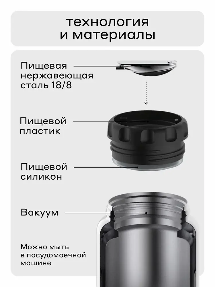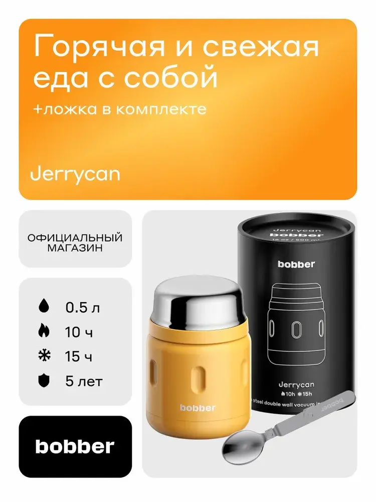 Jerrycan — это термос для еды с удобным широким горлом и встроенной складной ложкой. Термос объемом 470 мл сохраняет тепло до 10 часов, холод - до 15 часов. Jerrycan сделан из нержавеющей стали 18/8. Отдельные элементы пробки и крышки-чашки выполнены из пищевого силикона и безопасного пластика BPA-free. На глухой пробке термоса сделано металлическое основание, благодаря чему еда не соприкасается с пластиком, а внутри колбы не накапливаются запахи. Силиконовые кольца на крышке обеспечивают 100% герметичность.