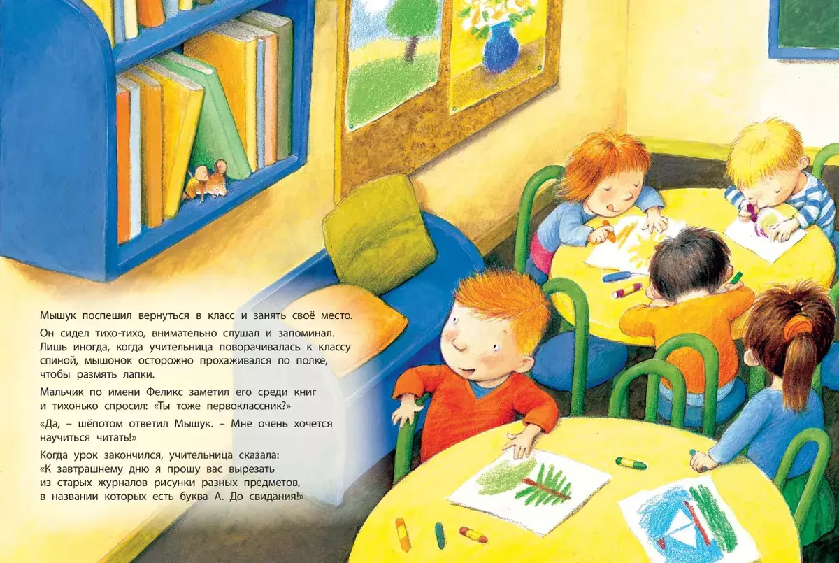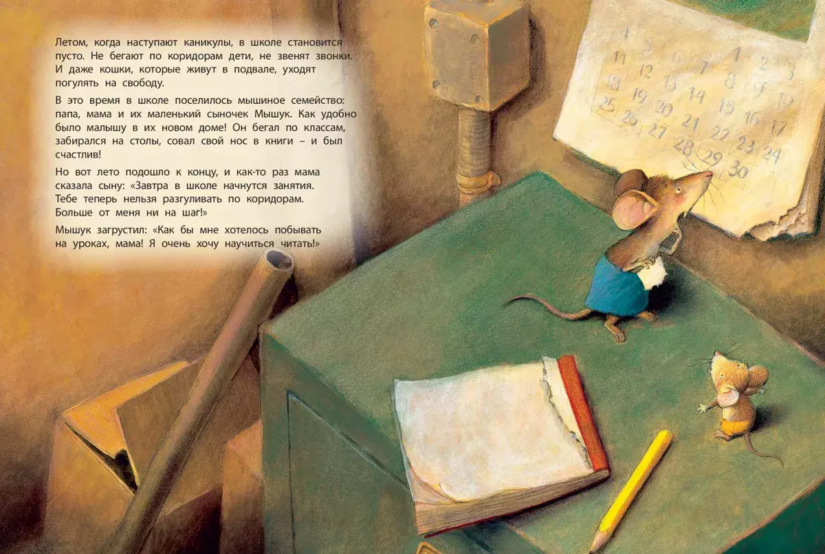 Трогательная и прекрасно иллюстрированная история о любви к знаниям. Во время каникул в опустевшей школе поселилась мышиная семья. А когда уроки возобновились, маленький мышонок тоже решил научиться читать. Он тайком пробирался в класс и вместе с первоклассниками старательно изучал буквы. Малыш решил когда-нибудь написать книгу. Тогда папа и мама мышонка тоже решили освоить грамоту…