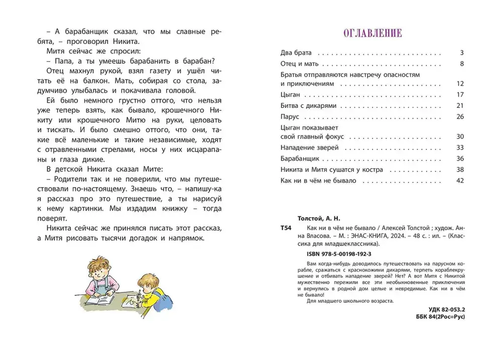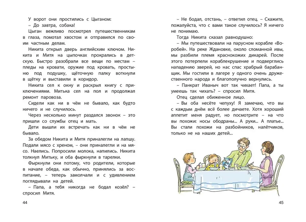 Вам когда-нибудь доводилось путешествовать на парусном корабле, сражаться с дикарями, терпеть кораблекрушение и отбивать нападение зверей? Нет? А вот Митя с Никитой мужественно пережили все эти необыкновенные приключения и вернулись в родной дом целые и невредимые. Как ни в чём не бывало!