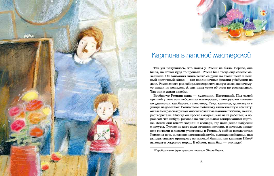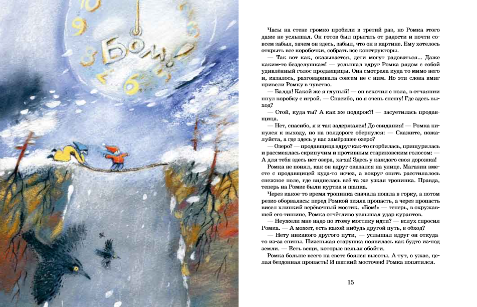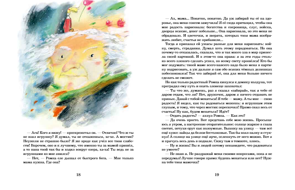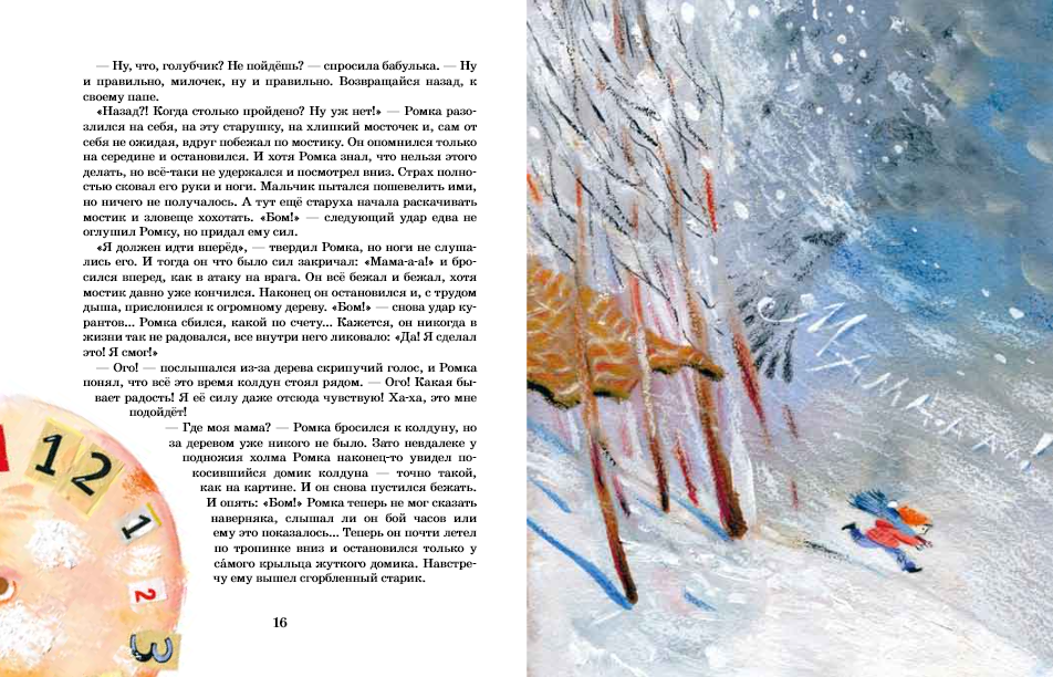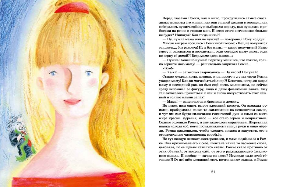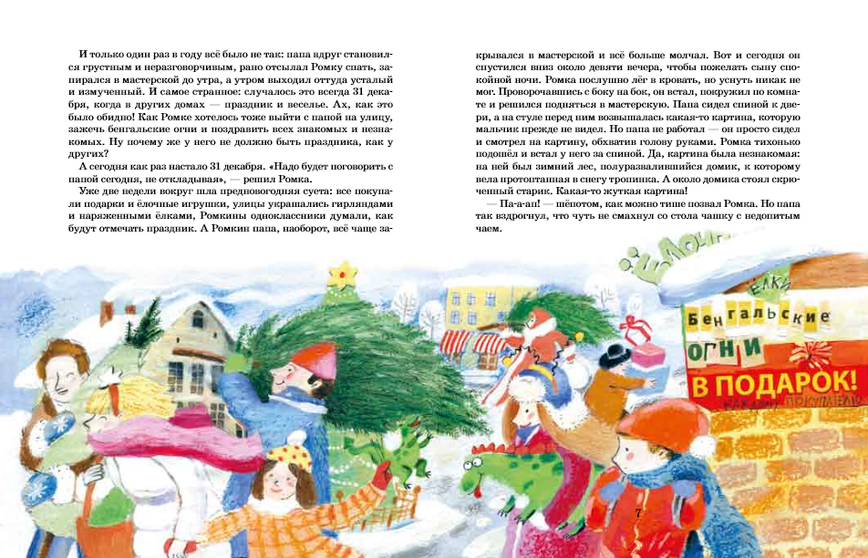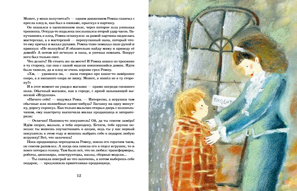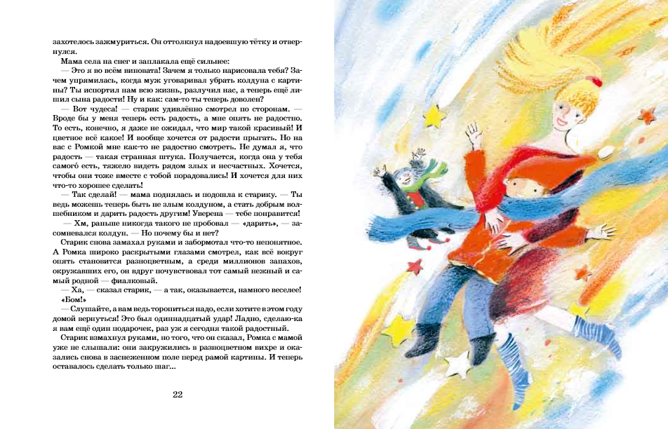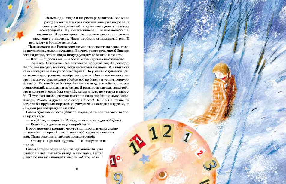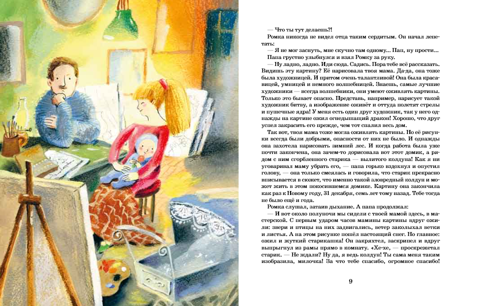 О том, что волшебная сила искусства может принести не только радость, но и стать причиной очень печальных и даже страшных событий, герой этой сказки Ромка узнал в новогоднюю ночь. Пока часы отбивали 12 ударов, он по собственной воле, повинуясь горячему желанию найти свою маму, шагнул в ожившую на несколько мгновений картину в папиной мастерской. В этом нарисованном и оказавшемся таким опасным мире ему пришлось пройти нелегкие испытания, победить свои слабости, страх и сделать правильный жизненный выбор. За очень короткое, как бы спрессовавшееся, время мальчик успел многое пережить и понял, как важно уметь радоваться жизни и дарить радость другим. Ведь мир вокруг нас будет таким, каким мы сами его видим и создаем.