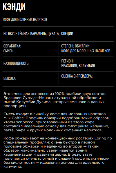 Эта смесь входит в нашу линейку кофе для молочных напитков и обжарена темнее, чем весь остальной наш кофе для эспрессо. Мы специально подобрали профиль обжарки так, чтобы эспрессо, приготовленный из этого кофе, составлял идеальную основу для капучино, латте и других молочных кофейных напитков. Для этого мы обжариваем кофе на конвекционных ростерах Loring по специальным профилям — очень быстро в первой половине обжарки и медленно во второй. Таким образом мы максимально увеличиваем время карамелизации и развития зерна. В результате получается очень плотный и сладкий кофе практически без кислотности — идеальная основа для идеального капучино!