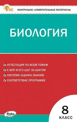 В пособии представлены контрольно-измерительные материалы (КИМы) по биологии для 8 класса. Издание составлено в соответствии с требованиями действующего ФГОС ООО. Порядок тем соответствует учебнику под редакцией В.В. Пасечника (М.: Просвещение), который входит в действующий федеральный перечень учебников. Структура КИМов аналогична структуре заданий ЕГЭ, что позволит постепенно подготовить учащихся к работе с подобным материалом. В конце издания предложены ответы к тестам. Пособие адресовано учителям, учащимся и их родителям.