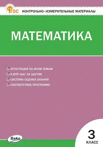 В пособии представлены контрольно-измерительные материалы по математике для 3 класса. Порядок тем соответствует учебнику М.И. Моро и др. УМК «Школа России», входящему в действующий федеральный перечень учебников. Все задания соответствуют программе общеобразовательных организаций и требованиям действующего ФГОС для начальной школы. Систематическая работа с материалами сборника позволит обучить школьников работе с тестами, что поможет в дальнейшем успешно выполнить задания государственной аттестации. Издание адресовано учителям начальных классов, школьникам и их родителям.