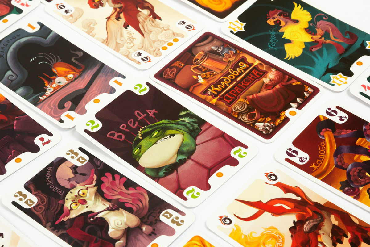 Как играть: В начале игры перед каждым игроком лежит 3 карточки взакрытую и 3 в открытую, образуя резерв игрока. Так же каждому игроку раздается по 5 карточек в руку. Каждый раунд игроки по очереди выкладывают свои карточки, соблюдая правила. При этом срабататывают особые свойства карточек: карточки злыдней могут заставить соперника пропустить ход или взять еще нескольо карт в руку, а карточки драконов помогут вам самим защитится от злыдня, выложенного соперником. Как только один из участников выложит все карточки из своей руки и резерва, раунд заканчивается. Остальные игроки подсчитывают, сколько монет они потеряли. После этого начинается следующий раунд. Игра заканчивается, когда один из игроков потеряет 21 золотую монету или больше. Так же в коробке вы найдёте карточки уловок и помех, которые добавят в игру ещё больш азарта!