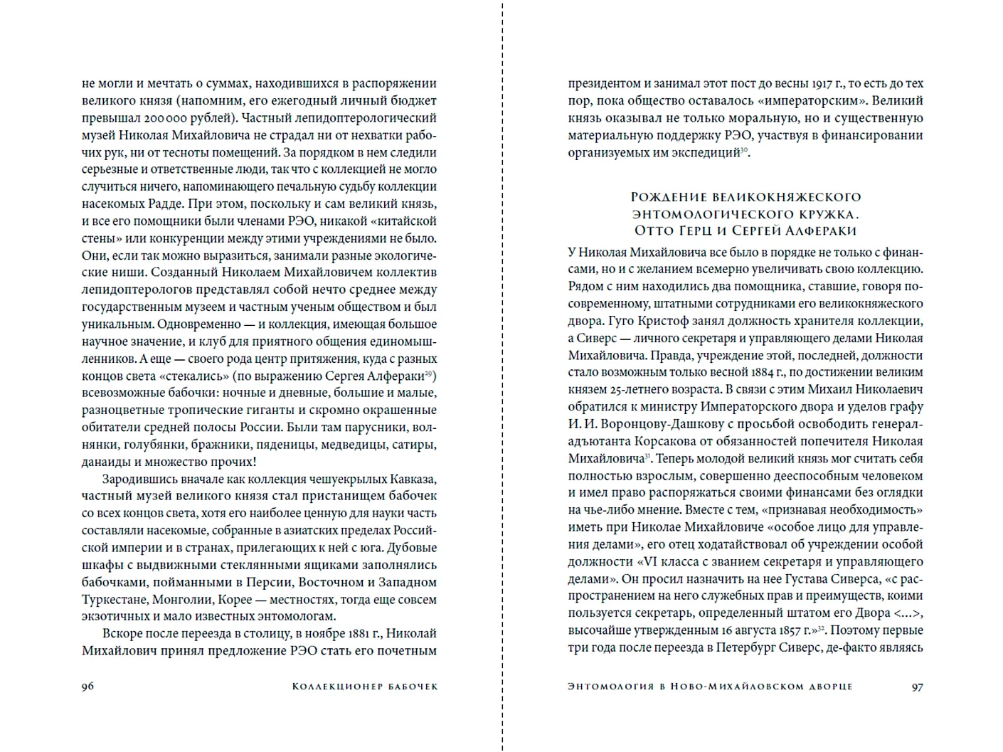 Посвящена одному из самых необычных представителей императорской фамилии Романовых — великому князю Николаю Михайловичу (1859–1919). Успешный военный, щедрый меценат, издатель, политик, он стал признанным специалистом в двух далеких друг от друга дисциплинах — отечественной истории и лепидоптерологии (раздел энтомологии, изучающий бабочек). Николай Михайлович был увлеченным коллекционером и собрал одну из крупнейших в мире частных коллекций бабочек. Высокий социальный статус и финансовые возможности позволили ему проложить свой, «царский» путь в науку. Объединив вокруг себя таких же страстных любителей насекомых, как и он сам, великий князь создал научный кружок, который стал одним из центров энтомологии в России в конце XIX в. В книге вы найдете также «портреты» ближайших соратников Николая Михайловича, каждый из которых был фигурой неординарной и оставил свой след в науке.