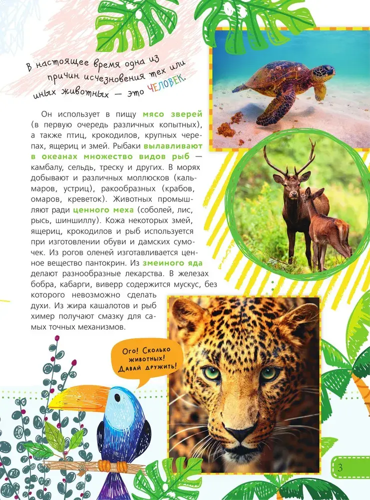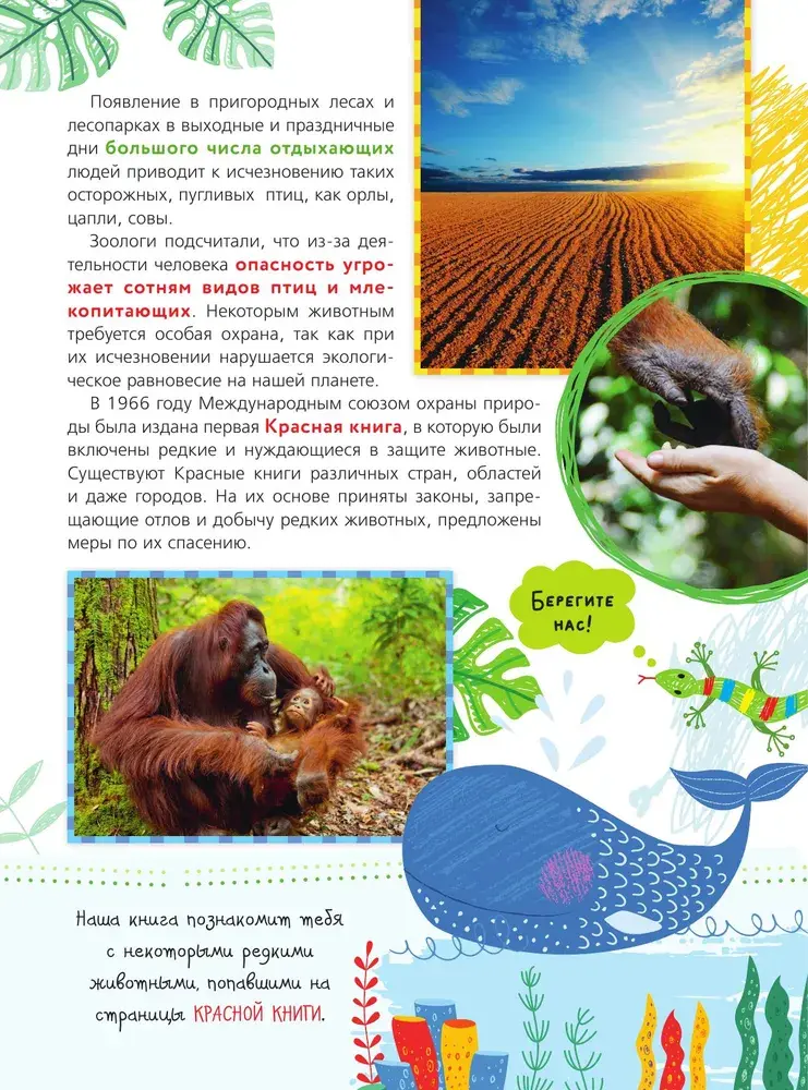 В этой книге ты увидишь своих самых любимых животных: тигра, слона, жирафа, носорога, дымчатого леопарда, большую панду, белого медведя и многих-многих других. К сожалению, теперь этих животных чаще можно увидеть в зоопарках, чем в живой природе. Но все-таки мы надеемся, что эти и многие другие прекрасные животные, живущие на нашей планете, сохранятся. Международный союз охраны природы и природных ресурсов защищает и оберегает не только самих животных, попавших в Красную книгу, но и места их обитания: леса, луга, горы, реки и озёра, моря и океаны. Это очень важно — охранять природу и тем самым спасти редких исчезающих животных дать им возможность вести привычный образ жизни, строить норы и вить гнезда, кормиться любимыми растениями, жить в чистой воде и выводить потомство. О жизни «краснокнижных» животных всего мира и расскажет малышам наша Красная книга.