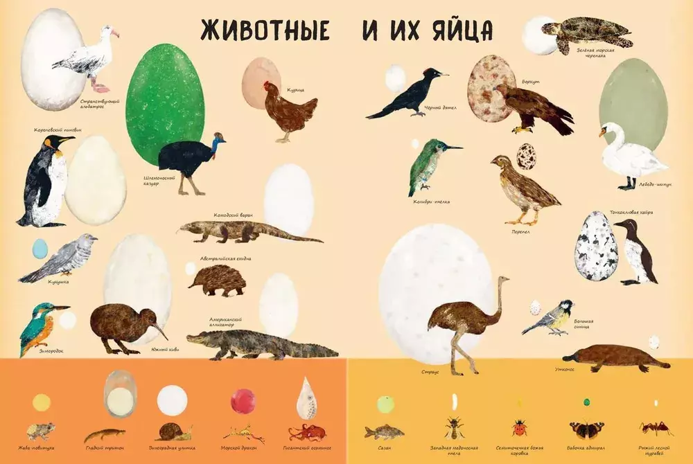 Каких только яиц не бывает на свете! Их можно найти на деревьях и в болотах, в земле и под землёй, высоко в горах и на дне океана. Яйца бывают всевозможных размеров, цветов и форм. Далеко не все они – птичьи. Змеи, лягушки, пчёлы, бабочки, осьминоги, аллигаторы, улитки и даже некоторые звери, например, утконосы, откладывают яйца для выведения потомства. О существах, которые появляются из яйца, рассказывает эта занимательная книга.