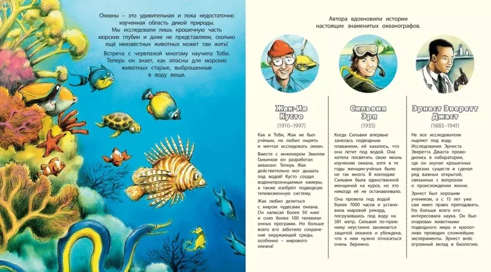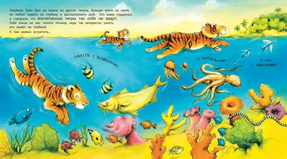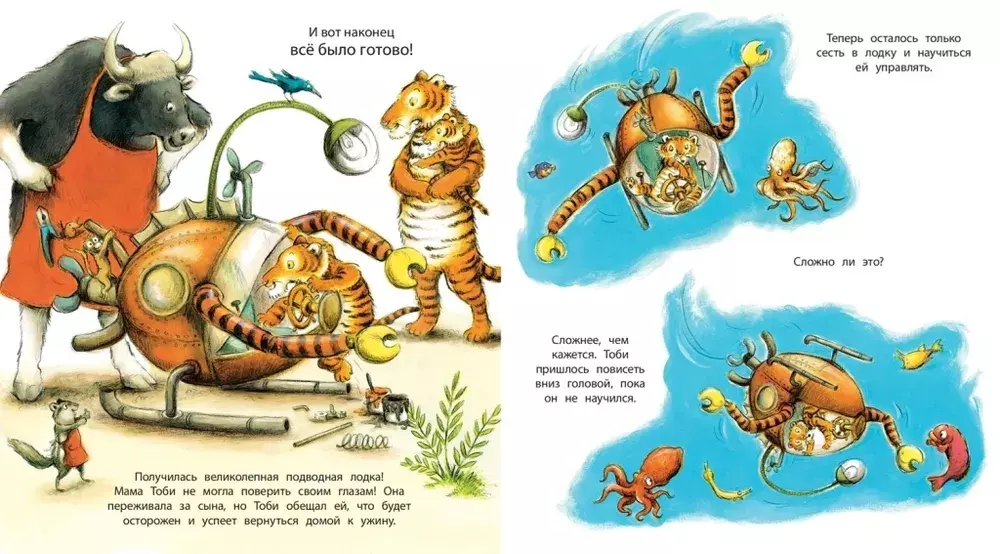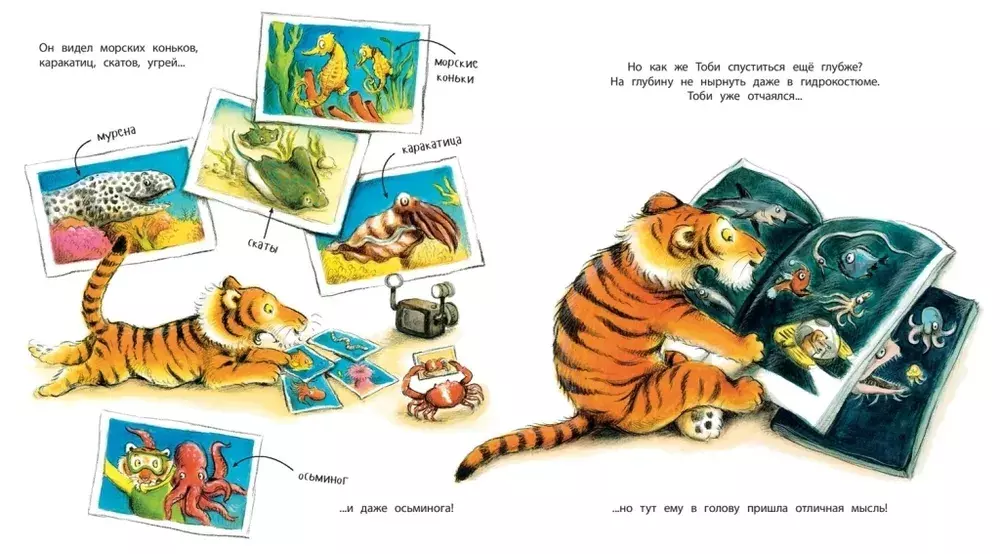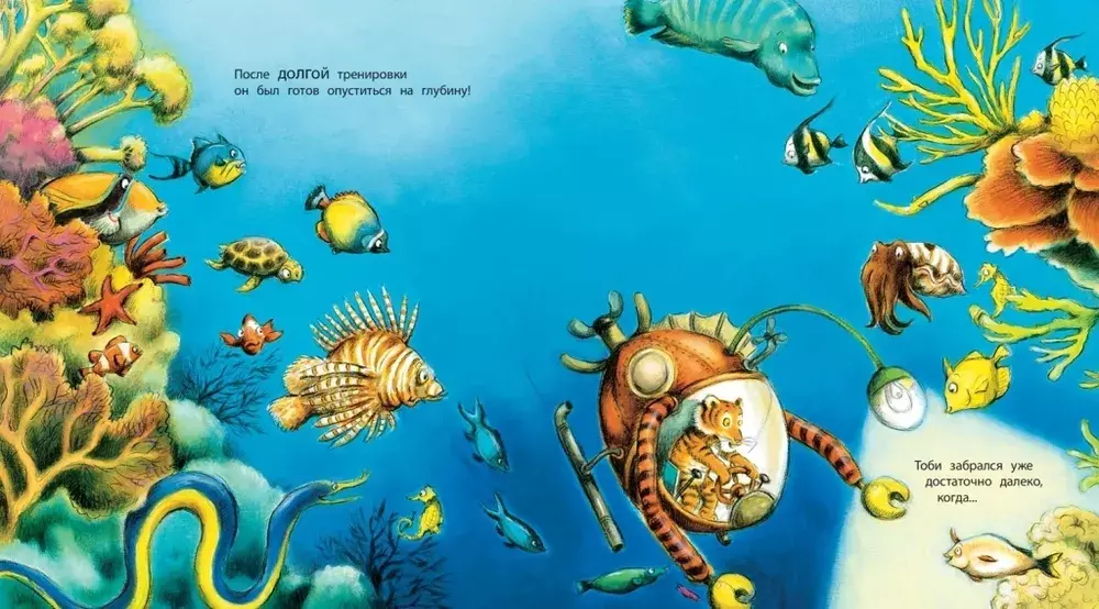 Тоби ещё совсем маленький тигрёнок но у него уже есть большая мечта Он хочет исследовать океан и увидеть своими глазами кто же живёт в его глубинах Для этого ему понадобятся отвага решимость а ещё самодельная подводная лодка Сколько интересного увидит Тоби в океане Об этом живо и увлекательно рассказывает Шерон Рентта Историю о любознательном тигрёнке завершают рассказы об известных океанографах которые вдохновили автора на написание этой книги Для чтения взрослыми детям