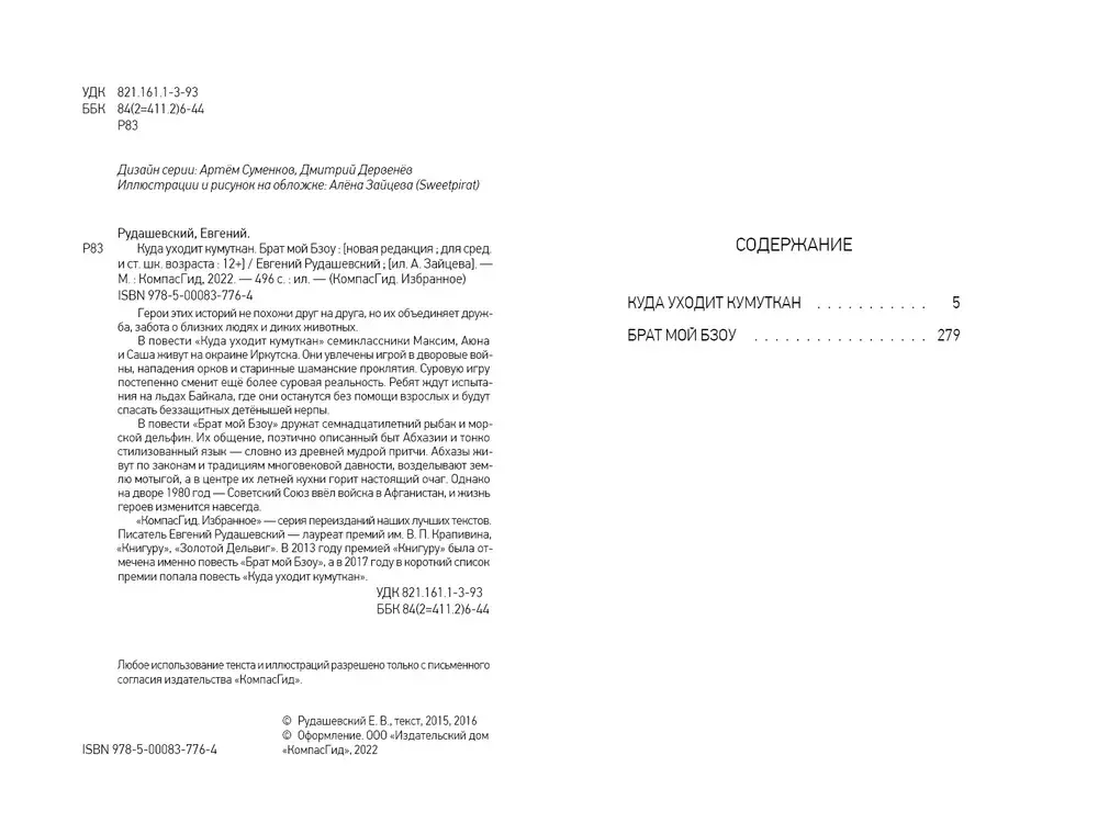 «КомпасГид. Избранное» — серия переизданий наших лучших текстов. Писатель Евгений Рудашевский — лауреат премий им. В. П. Крапивина, «Книгуру», «Золотой Дельвиг». В 2013 году премией «Книгуру» была отмечена именно повесть «Брат мой Бзоу», а в 2017 году в короткий список премии попала повесть «Куда уходит кумуткан».