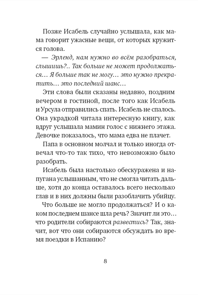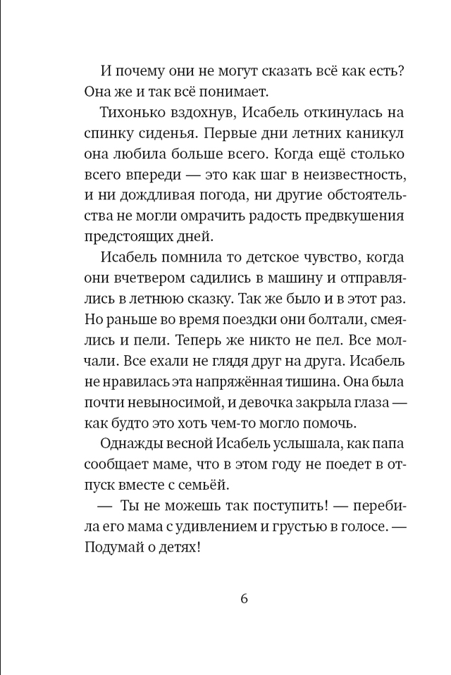 Двенадцатилетняя Исабель и её младшая сестра Урсула едут на каникулы к бабушке и дедушке. Впереди череда безмятежных летних дней: завтраки в саду, лесные прогулки, неспешные разговоры… Но в этой беззаботности сквозит тревога. Исабель ощущает чьё-то незримое присутствие, слышит мольбы о помощи — и не может их игнорировать. Странные сны, запертая дверь в подвал, вырезанные на дереве инициалы, старые фотографии и тайник в гроте у лесного озера в конце концов должны сложиться в картину, которая станет ключом к прошлому и дорогой в будущее.