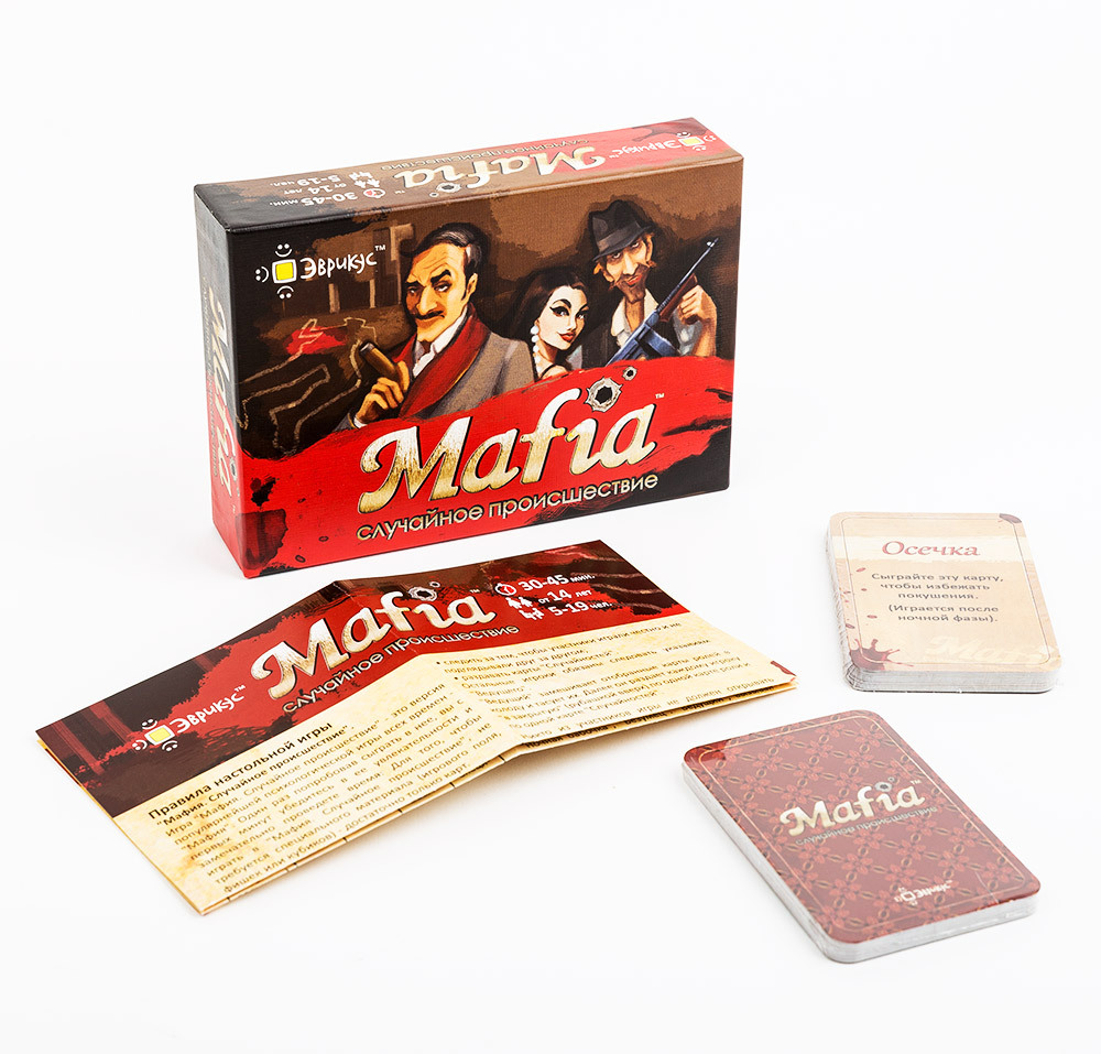 Город засыпает, просыпается мафия! "Mafia. Случайное происшествие" - версия популярной психологической игры, в которой жители города вычисляют и обезвреживают людей из мафии, а мафиози - противодействуют им. Детективный сюжет, интрига и право выбора делают эту игру безусловным хитом уже много лет. Помимо обычного противостояния участников подстерегают разнообразные случайные происшествия, которые делают игру ещё более интригующей. Кому подойдёт эта игра? Большой компании: игра позволяет собрать до 19 участников. Поклонникам детективных игр. В дорогу: для игры не требуется большого стола.