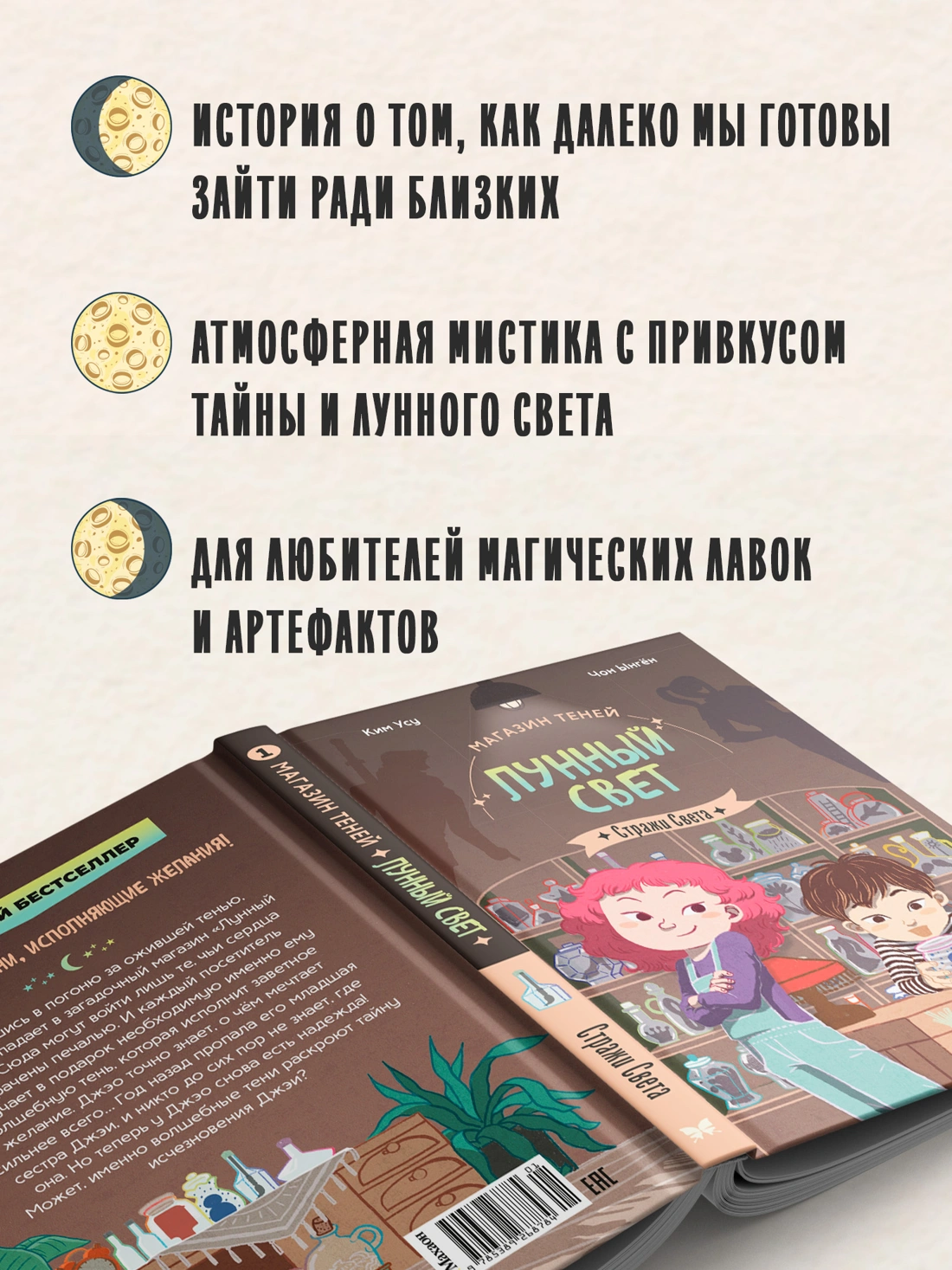 Бросившись в погоню за ожившей тенью, Джэо попадает в загадочный магазин «Лунный свет». Сюда могут войти лишь те, чьи сердца омрачены печалью. И каждый посетитель получает в подарок необходимую именно ему волшебную тень, которая исполнит заветное желание. Джэо точно знает, о чём мечтает сильнее всего… Год назад пропала его младшая сестра Джэи, и никто до сих пор не знает, где она. Но теперь у Джэо снова есть надежда! Может, именно волшебные тени раскроют тайну исчезновения Джэи?