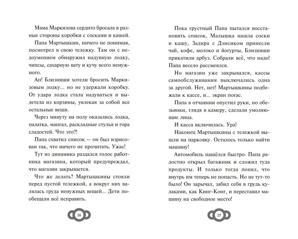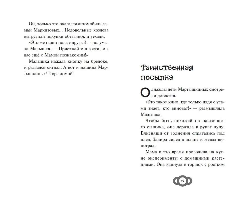 В сборник входят двадцать пять серий мультсериала «Мартышкины» от «Союзмультфильма», пересказанные простым и живым языком. Рассказы сопровождаются цветными вклейками с кадрами из мультфильма. Книга понравится как маленьким фанатам, так и тем, кто впервые знакомится с мультиком.