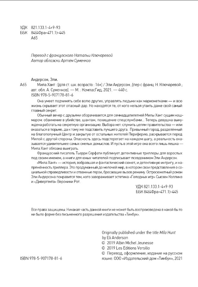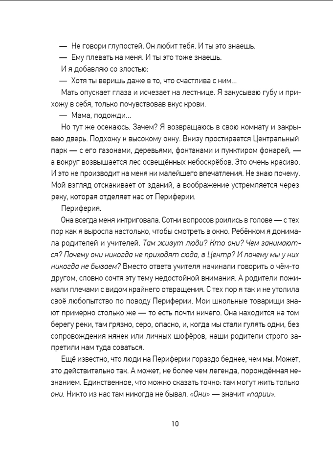 Она умеет подчинять себе волю других, управлять людьми как марионетками — и всю жизнь скрывает этот опасный дар. Но находятся те, от кого нельзя утаить даже свой самый главный секрет. Обычный вечер с друзьями оборачивается для семнадцатилетней Милы Хант сущим кошмаром: обвинение в убийстве, шантаж, похищение спецслужбами... Теперь девушка вынуждена работать на секретную организацию. Выбора нет: служить целям правительства — или подставить друга и оказаться в тюрьме. Привычный город, разделённый на благополучный Центр и закрытую от остальных жителей Периферию, раскрывается перед Милой с другой стороны. Опасность здесь подстерегает на каждом шагу, а реальность оказывается удивительнее самых смелых домыслов.
