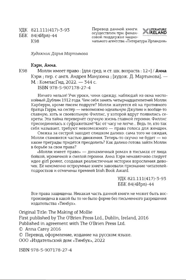 Ничего нельзя! Учи уроки, чини одежду, наблюдай из окна неспокойный Дублин 1912 года. Чем себя занять четырнадцатилетней Молли Карберри, кроме писем подруге? Молли жалуется ей на противного братца Гарри, на сестёр — невозможно идеальную Джулию и вообще-то славную, хоть и своевольную Филлис, у которой вдруг появились секреты. Эта тайна перевернёт скучную жизнь главной героини: Филлис присоединилась к суфражеткам! Час от часу не легче… Ведь те, кто так себя называет, требуют невозможного — права голоса для женщин.