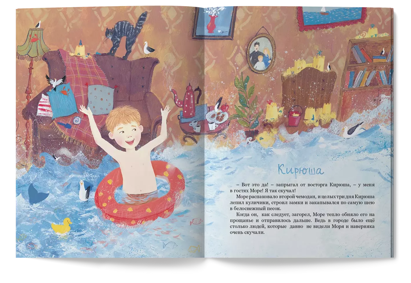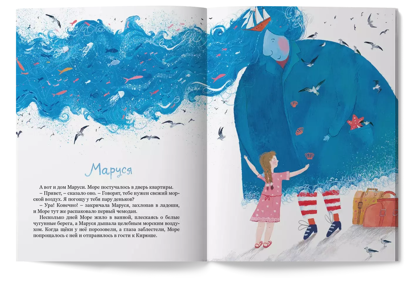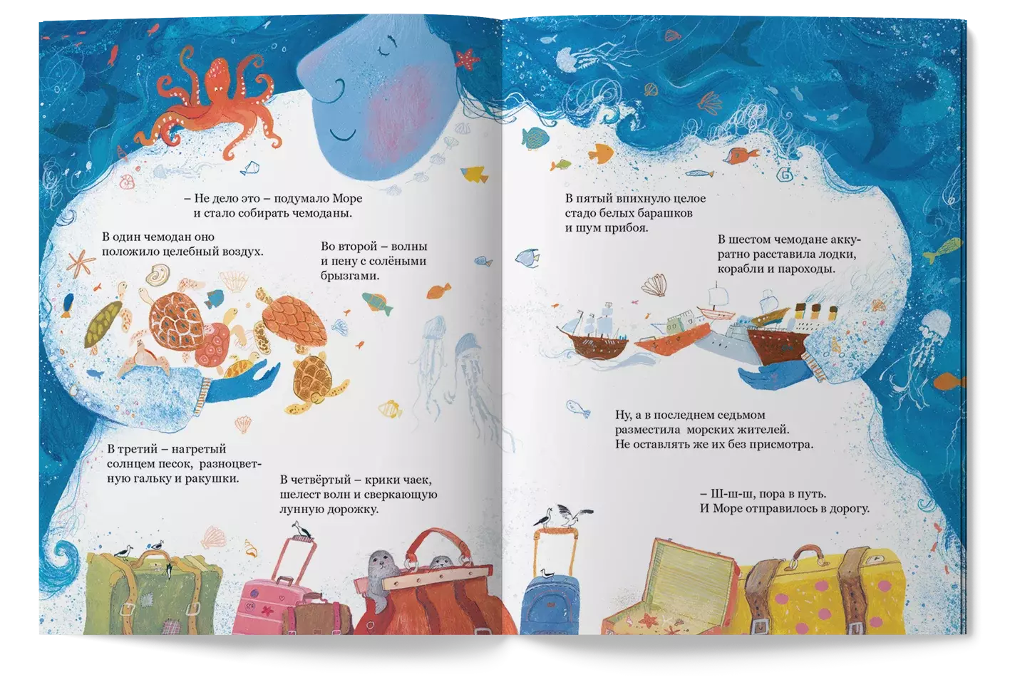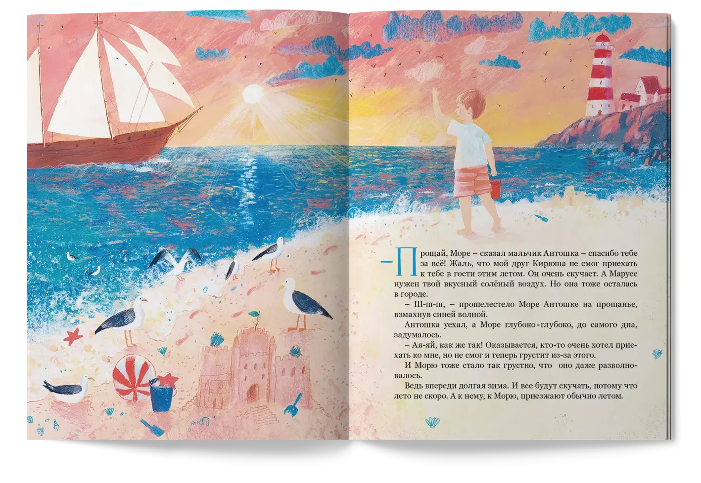 Как здорово гостить у Моря! Вдоволь купаться, загорать, строить замки из песка и дышать солёным воздухом. Жаль только, что не всегда выдаётся такая возможность. Однажды Море узнало, что кто-то грустит из-за этого. Оно тут же собрало чемоданы и отправилось в город. Море привезло с собой гостинцы, которые щедро раздавало всем у кого гостило. И шелест волн, и крики чаек, и тёплый песок. Оно отдавало себя, а в ответ получало благодарность и любовь. Потому что разве можно не любить Море!