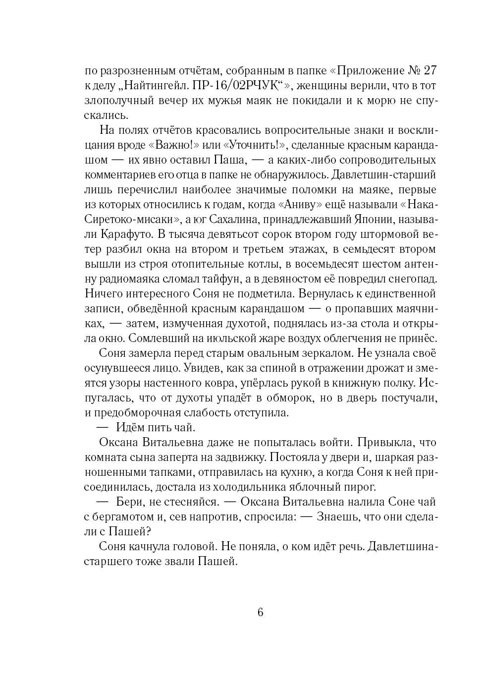 Пятьдесят лет назад на сахалинском маяке Анива бесследно пропали два смотрителя. В прошлом году их судьбу разделил историк из Иркутска. Месяц назад молодой археолог Павел из антикварного магазина «Изида» попытался раскрыть тайну гиблого маяка и тоже пропал. Теперь на юг Сахалина прилетает его девушка Соня. Чтобы найти Павла, она должна выяснить, почему вообще Аниву построили на безжизненной морской скале, а главное, разобраться, как история маяка связана с пугающими мифами эскимосов и фантастическими рассказами американских китобоев. Чем дальше Соня идёт по следам Паши, тем более подозрительным становится творящееся вокруг, граница между реальностью и мороком стирается, и Соне всё чаще кажется, что в действительности она идёт по своим собственным следам.