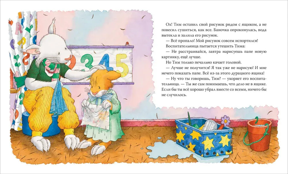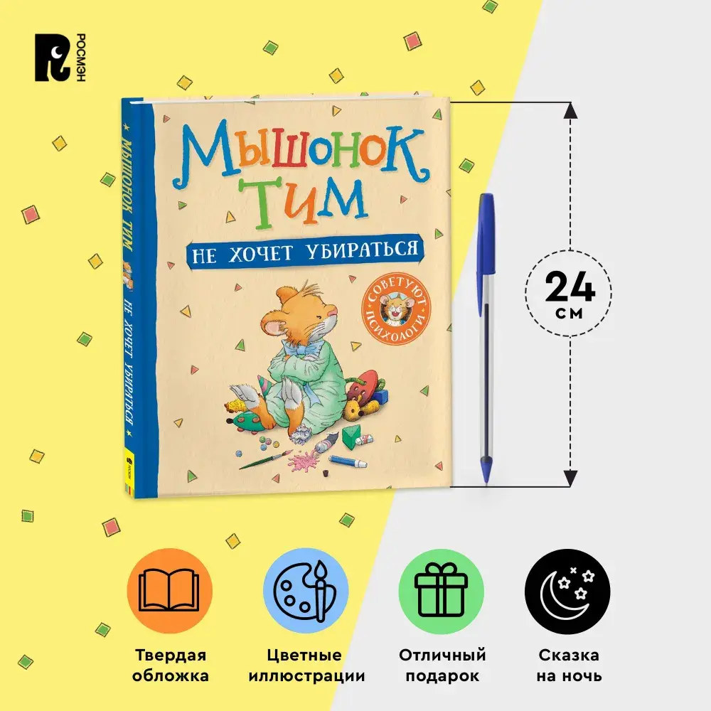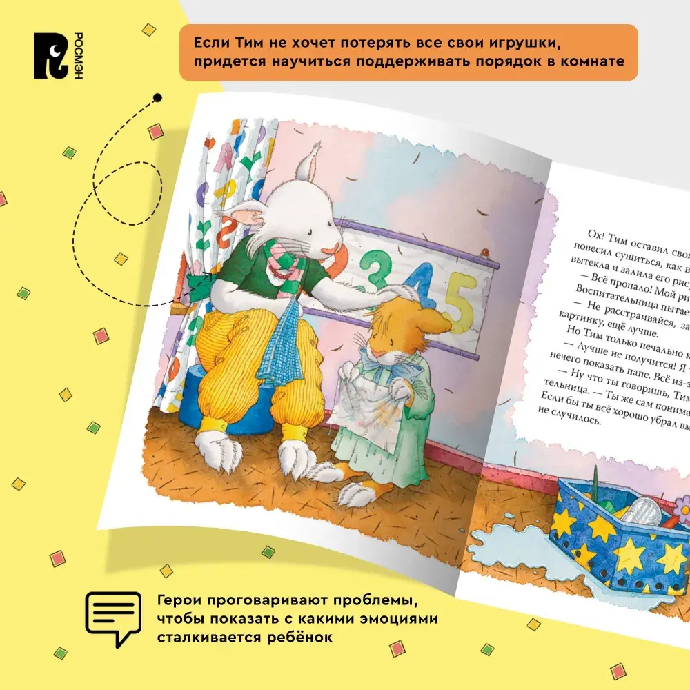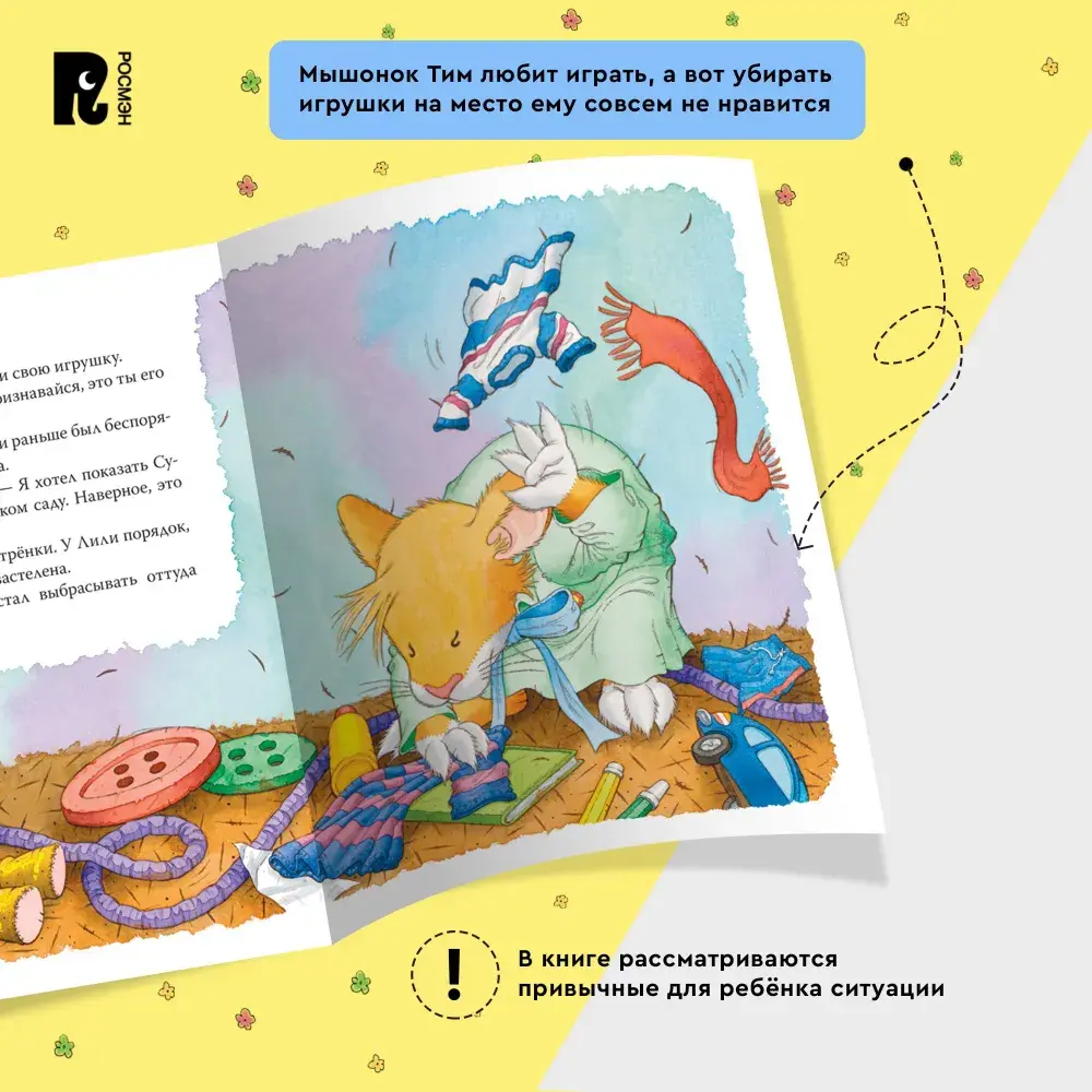 Серия книг про смешного и обаятельного мышонка Тима поможет малышам понимать, признавать и называть свои чувства, научиться общаться со сверстниками и справляться с трудными ситуациями. Мышонок Тим любит играть с друзьями и рисовать акварелью. А вот убирать игрушки и краски на место ему совсем не нравится! Но если наводить порядок кое-как, можно потерять в комнате любимую игрушку или испортить рисунок для папы. Вскоре Тим убедится, как это важно — вовремя убирать за собой и поддерживать порядок в комнате.
